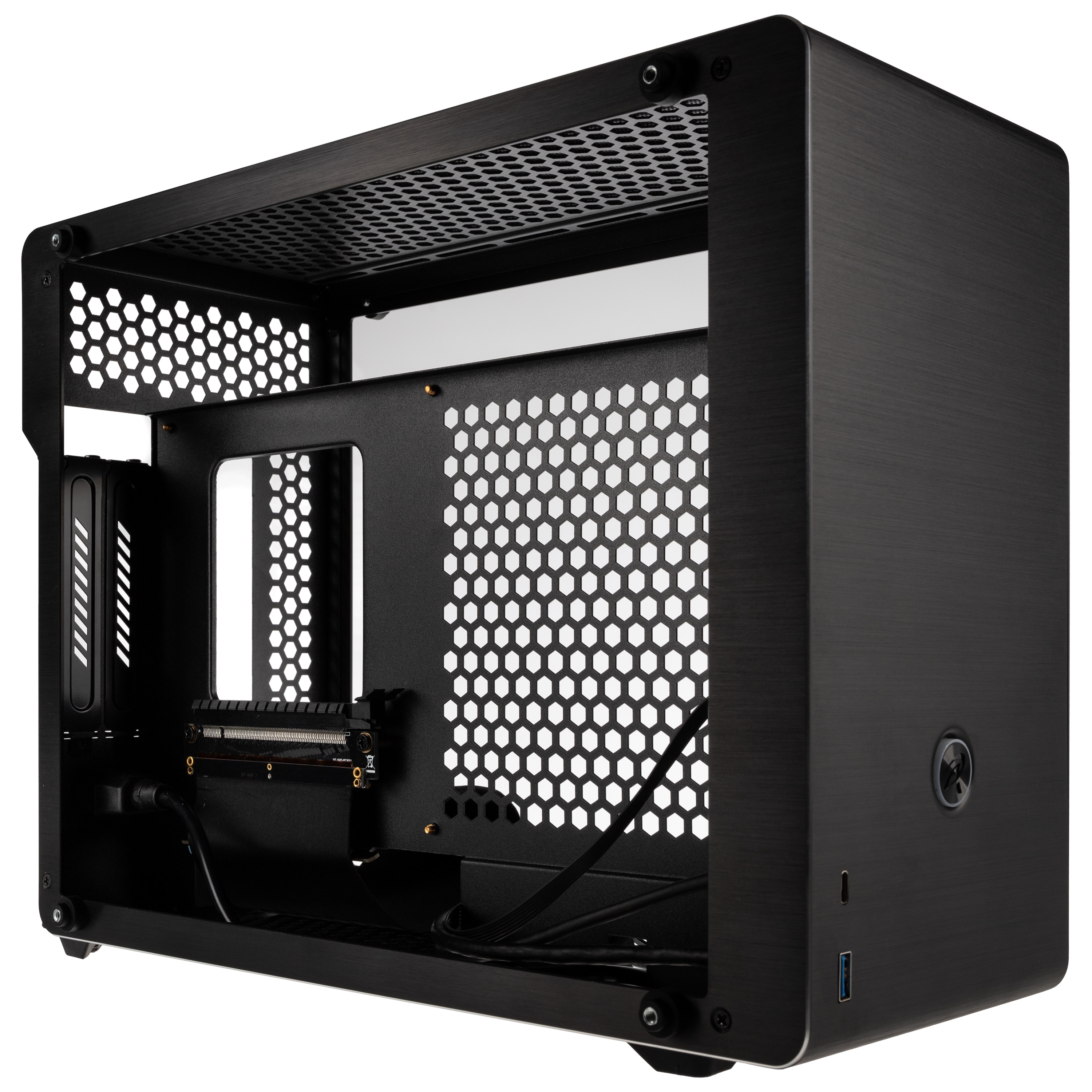 Das Äußere des Ophion Gehäuses hat mit seinem Hairline-Finish aus Aluminium einen unverwechselbaren Look. Die beiden Seitenteile bestehen aus 3 mm starkem Temperglas und ermöglichen somit den Einblick in das Innenleben.