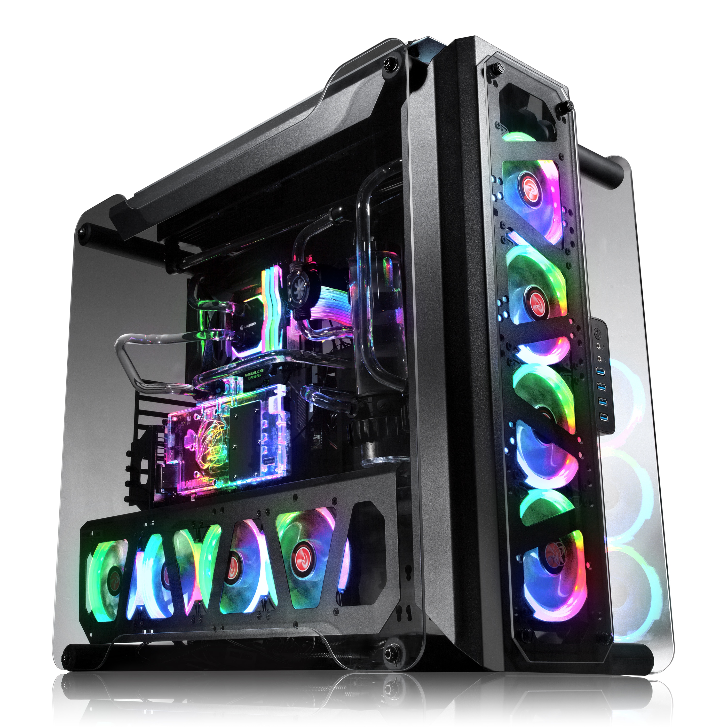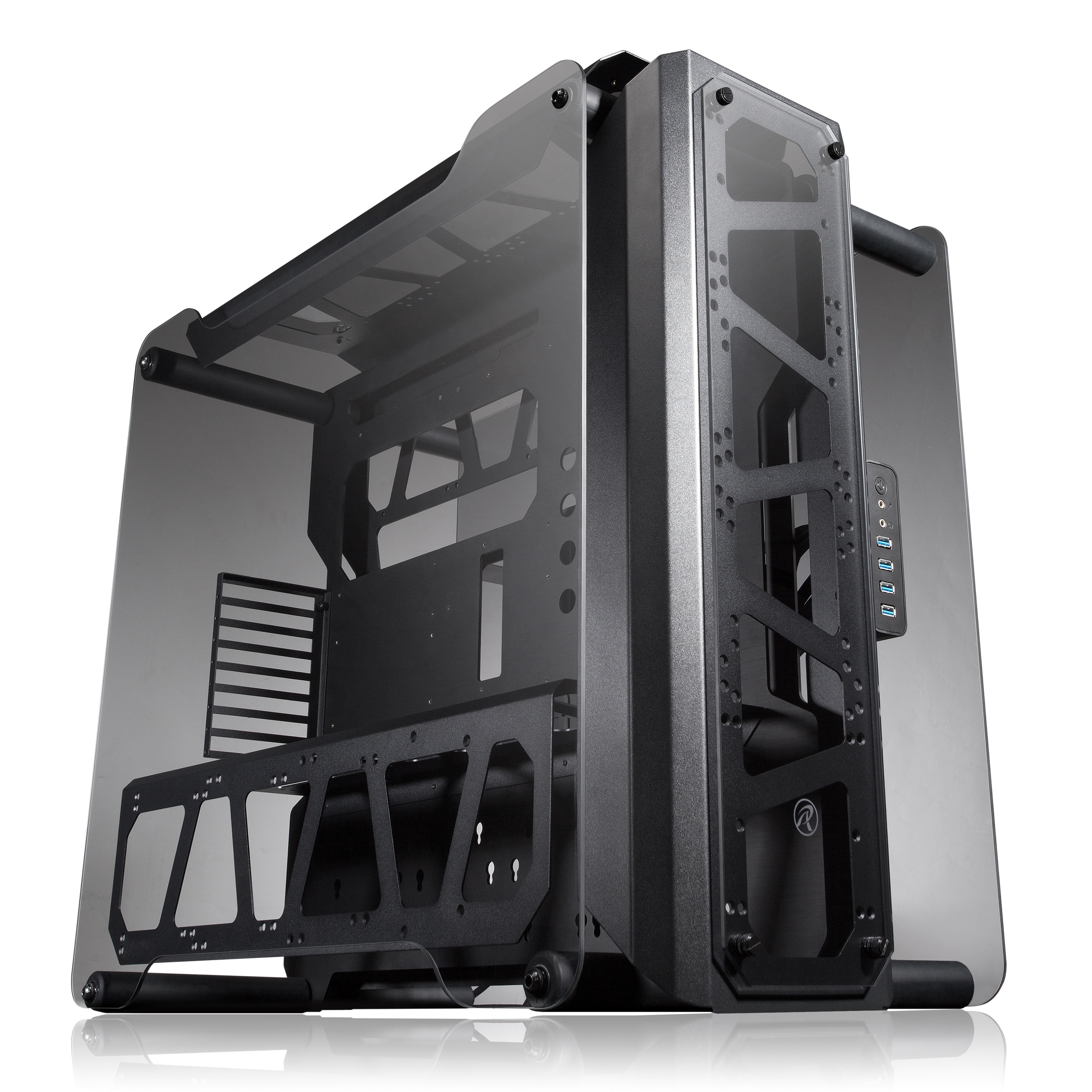 High-End-Enthusiasten können sich mit dem Raijintek Enyo auf ein Goliath-Gehäuse der Extraklasse freuen. Dieser Big-Tower mit außergewöhnlichem Design ist gleichzeitig ein Showcase-Gehäuse und ein Benchtable im Industrie-Look. Das fast offene Gehäuse wird bloß von zwei Seitenteilen und dem Deckel sowie der Vorderseite aus 4 mm dickem Temperglas von der Außenwelt abgeschirmt. Der in der Mitte befindliche Rahmen beinhaltet den PCI-Bracket für den Mainboard-Tray und weitere Hardware. Zwischen den Temperglas-Fenstern und dem zentralen Tower-Rahmen bleiben geräumige Zwischenräume offen, wodurch das große Gehäuse dennoch einen Panormablick auf die Hardware ermöglicht.