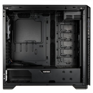 Auch im Inneren setzt sich die konsequente Optik fort. Neben gummierten Kabeldurchlässen, die durch das Seitenfenster betrachtet werden können, findet sich eine abgeschlossene Kammer für das ATX-Netzteil. Dieses wird von unten belüftet und gibt seine Wärme nicht an die anderen Komponenten des Computers ab. Der Midi-Tower ist so aufgebaut, dass Komplikationen beim Einbau der einzelnen Komponenten nahezu unmöglich sind. Durch eine kluge Aufteilung des vorhandenen Platzes werden Raumkonflikte geschickt vermieden. Einbauen lassen sich unter anderem ein Mainboard bis E-ATX-Formfaktor und acht 3,5-Zoll- sowie fünf 2,5-Zoll-Datenträger. Insgesamt bietet das Gehäuse viel Platz für die Verwirklichung aller denkbaren Träume.