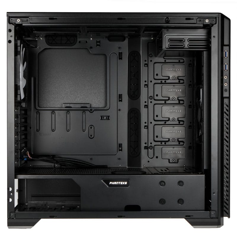 Beim verlosten Midi-Tower handelt es sich um eine verbesserte Version des Enthoo Pro M. Die von uns verloste Version enthält zusätzlich ein Seitenteil aus gehärtetem Glas, das einen Einblick in das Innenleben des Rechners erlaubt. Technikfreunde erhalten durch dieses Highlight die Möglichkeit, der Hardware ihres liebgewonnen Computers bei der Arbeit zuzuschauen. Auch optisch stellt das Glasfenster einen absoluten Pluspunkt dar. Das Gehäuse verfügt über zwei vorinstallierte, 140 mm große Lüfter, die mit weiteren Lüftern ergänzt oder durch Radiatoren ersetzt werden können. Auf der Vorderseite befindet sich darüber hinaus eine abnehmbare Frontblende, welche ein schwarzes Mesh als Lufteinlass enthält. Außerdem finden sich dort ein 5,25-Zoll-Einschub, zwei USB-3.0-Anschlüsse, zwei Audio-Anschlüsse, I/O-Ports und ein Reset-Button.