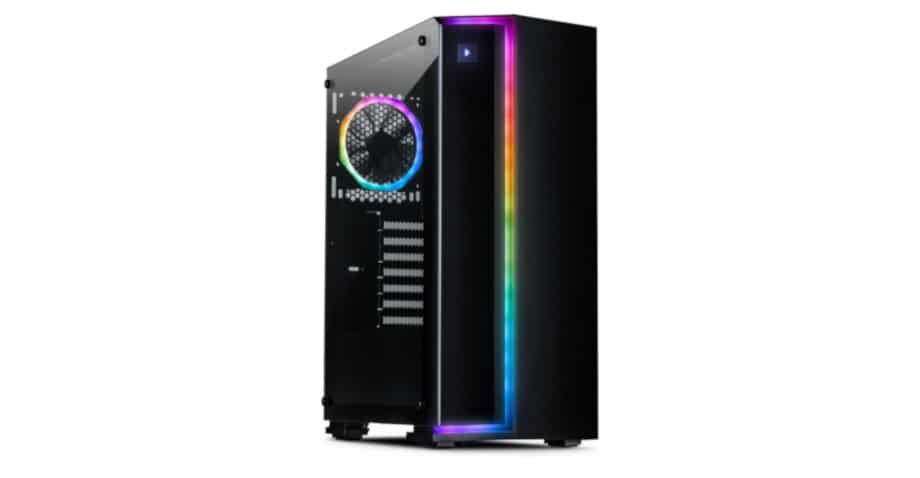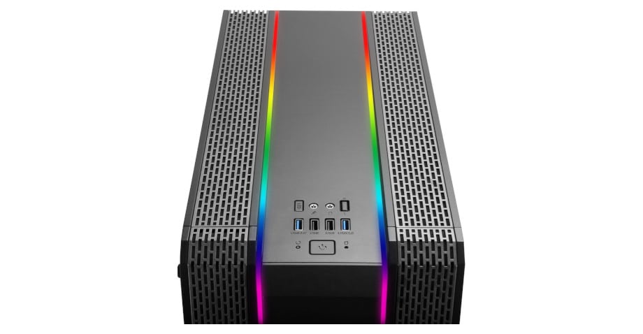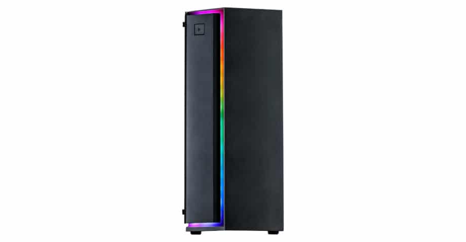 Die linke Seite des Gehäuses besteht fast vollständig aus klarem Tempered Glass, um so die Sicht auf die verbaute Hardware zu ermöglichen. Die vorinstallierte RGB-Beleuchtung umfasst vier LED-Streifen, die sich von der Front bis zum Ende der Oberseite ziehen. Außerdem ist an der Rückseite ein 120-Millimeter-Gehäuselüfter mit RGB-Beleuchtung vorinstalliert. Die ebenfalls vorinstallierte Steuerplatine kann bis zu sieben weitere RGB-Lüfter kontrollieren. Außerdem reguliert sie die Geschwindigkeit der Gehäuselüfter und ermöglicht Effekte wie Lauflicht oder Regenbogen.