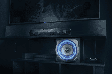 Im Subwoofer ist ganz dem Trend folgend eine blaue LED integriert, die wahlweise statisch oder im Takt der Musik pulsierend leuchtet. Auf Wunsch kann sie natürlich auch komplett deaktiviert werden. Die Steuerung der Beleuchtung ist komfortabel per Fernbedienung möglich, über die auch die anderen Funktionen wie die Wahl des Audioeingangs, die Intensität des Bass und die Lautstärke gesteuert werden können.