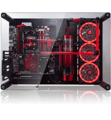 Wollt ihr eine individuelle Wasserkühlung einsetzen, lässt sich auch diese problemlos verbauen. Das kommt dem guten Stück nicht nur optisch zugute, sondern sorgt auch dafür, dass der Raijintek PAEAN Benchtable stets leise arbeitet. Grafikkarten mit bis zu 40 Zentimetern können ebenfalls spielend untergebracht werden, sofern ihr auf ein Wasserkühlungsreservoir verzichtet.