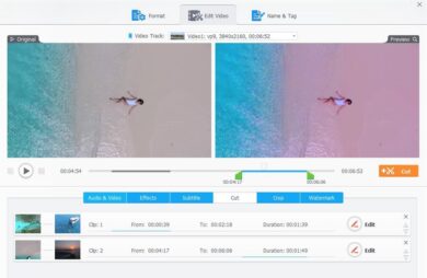 VideoProc Converter wartet mit äußerst umfangreichen Bearbeitungsmöglichkeiten auf. Neben grundlegenden Optionen wie Schneiden, Croppen, Untertiteln, Drehen, dem Einfügen von Effekten oder dem Zusammenfügen verschiedener Videos stehen etliche weitere Möglichkeiten zur Verfügung, die eine professionelle Bearbeitung – und damit bestmögliche Videoqualität – ermöglichen. Verwackelte Videos lassen sich stabilisieren, Fisheye-Effekte können eliminiert, Geräusche entfernt, GIF-Dateien erstellt oder Wasserzeichen mit Text, Logo und Bild angelegt werden.