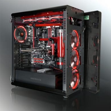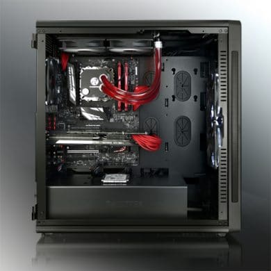 Äußerlich hebt das Gehäuse sich stark von anderen Gehäusen ab. Dank des edel gestalteten Aluminiums macht es optisch einiges her. Auch ein vertikaler Laufwerksschacht für ein optisches Slimline-Laufwerk sowie Platz für den Aufbau umfangreicher Luft- oder Wasserkühlungen ist vorhanden.