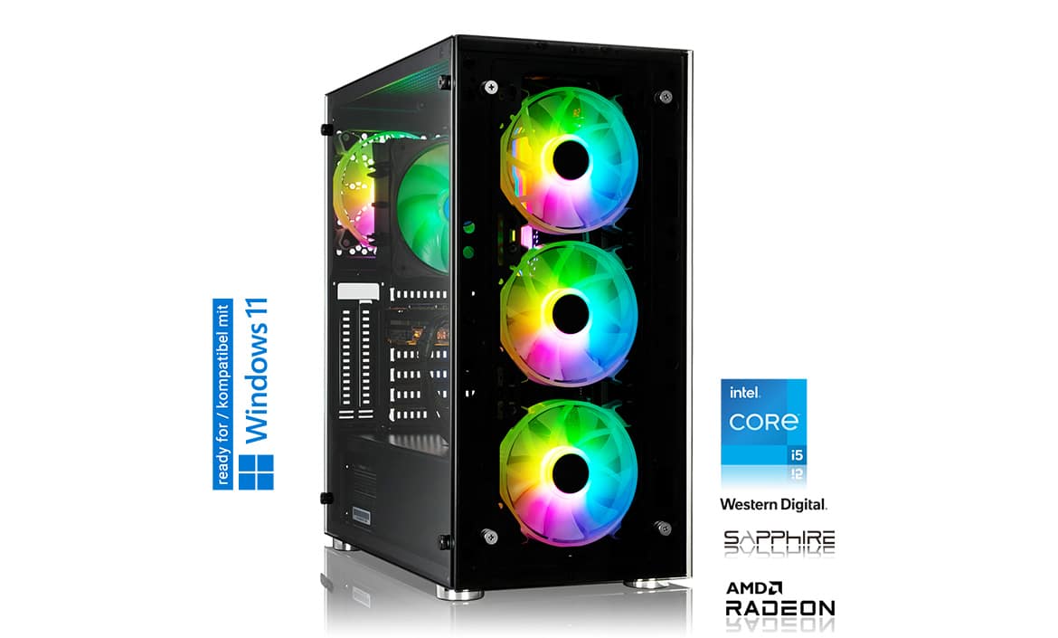 Als CPU kommt der aktuelle Intel Core i5-12400F zum Einsatz, der sechs Rechenkerne mit 12 Threads und einer Taktrate von 2,5 GHz (4,4 GHz im Turbo-Modus) kombiniert. 16 Gigabyte schneller Corsair Vengeance RGB High-Speed-Arbeitsspeicher und eine AMD Radeon RX 6700 von Sapphire mit 10 GB VRAM sorgen für eine herausragende Performance.