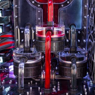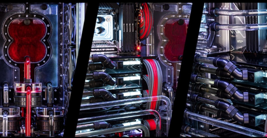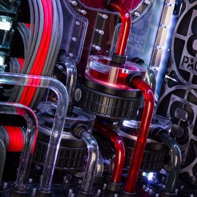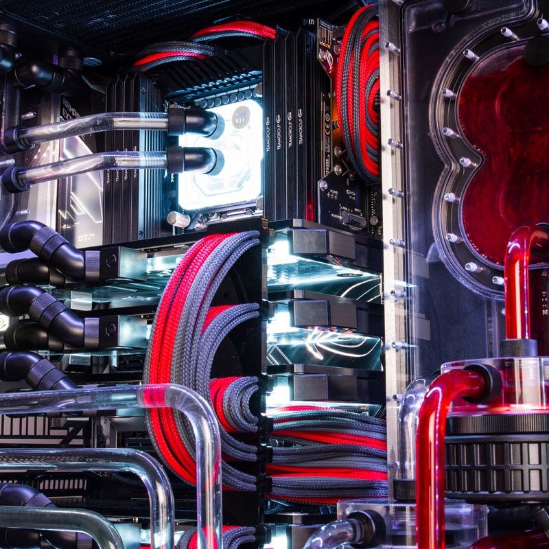 Erreicht wird diese Leistungssteigerung durch die Auswahl der jeweils besten erhältlichen Chips der Modellreihe und eine Hochleistungswasserkühlung, die die entstehende Abwärme mühelos und zugleich sehr leise abführt. Das System verfügt über drei unabhängige Kühlkreisläufe, die jeweils über eine eigene Aquaero 6 von Aqua Computer verfügen. Das Hauptsystem verfügt über zwei 480-mm-Radiatoren für den Prozessor und die Grafikkarten sowie einen weiteren 360-mm-Radiator, der exklusiv die Grafikkarten kühlt. Auch beim sekundären System ist ein eigener 360-mm-Radiator verbaut.
