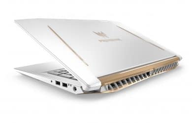 Beim Acer Predator Helios 300 Special Edition handelt es sich um einen Gaming-Laptop im weißen Gehäuse, das mit Goldverzierungen versehen wurde.