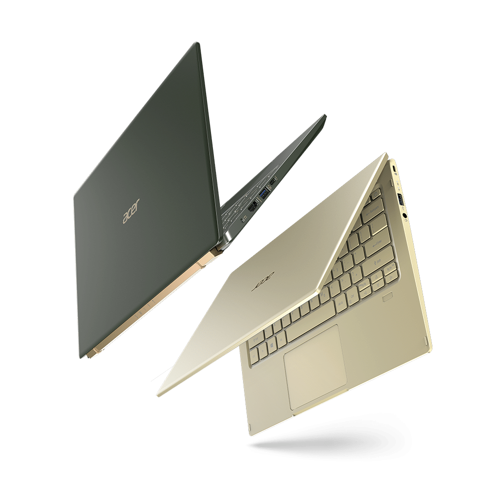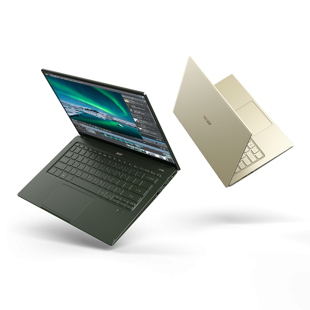 Das Notebook wird in zwei Farben erhältlich sein – Mystisch-Grün und Safari-Gold, beide mit edlen Goldakzenten. Das Gehäuse besitzt zudem über ein spezielles Scharnier, welches das Gerät bei geöffnetem Bildschirm aufstellt und ein ergonomischeres Tippen und eine bessere Kühlung ermöglicht. Das Swift 5 besitzt einen großen 56 Wh-Akku der bei einer Ladezeit von 30 Minuten für vier Stunden wieder einsatzbereit ist. Als Anschlüsse sind USB Type-C, Thunderbolt und USB 3.2 Gen 2-Port sowie Dual-Band Intel Wi-Fi 6 und Bluetooth 5.0 verfügbar.