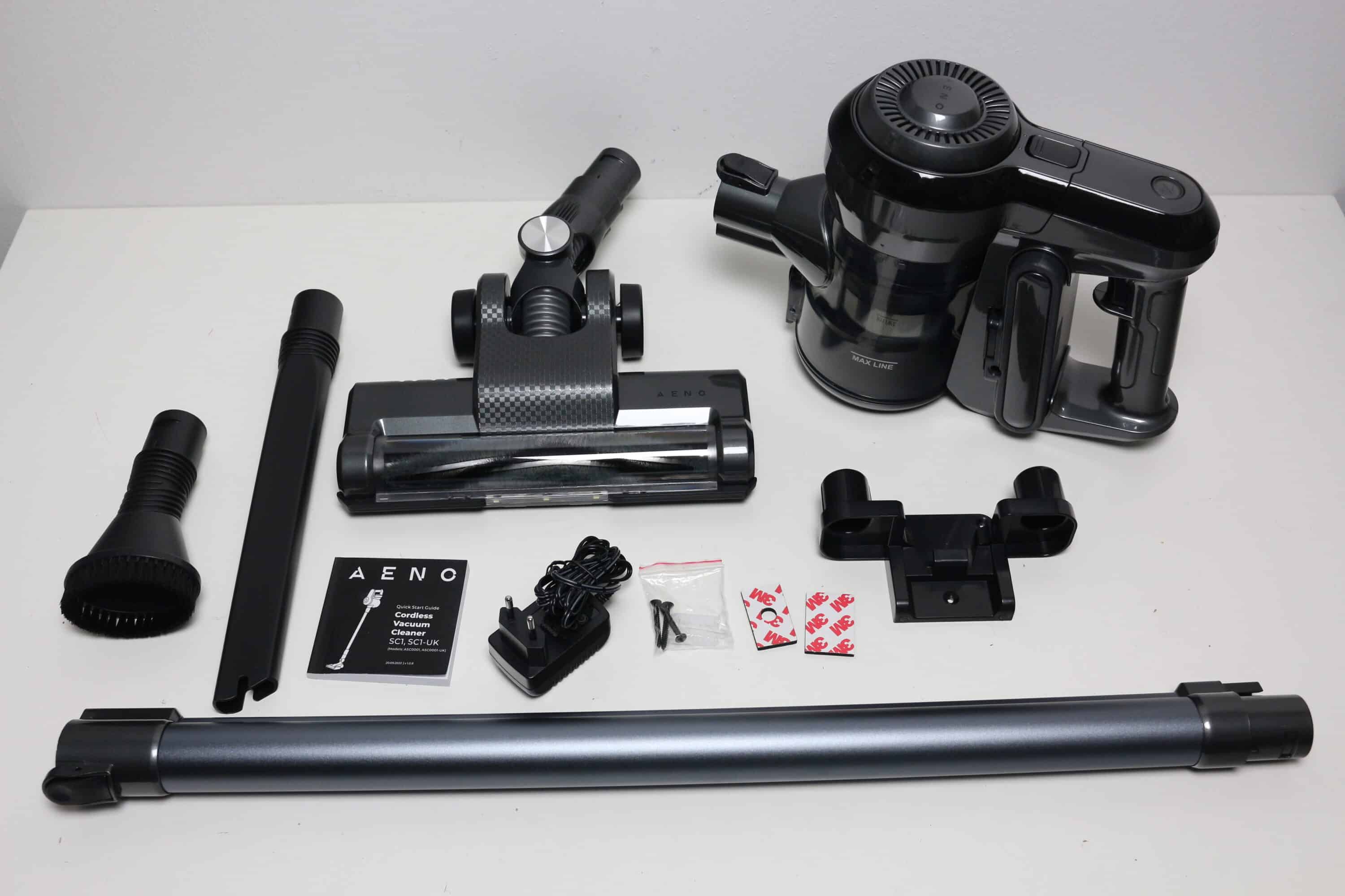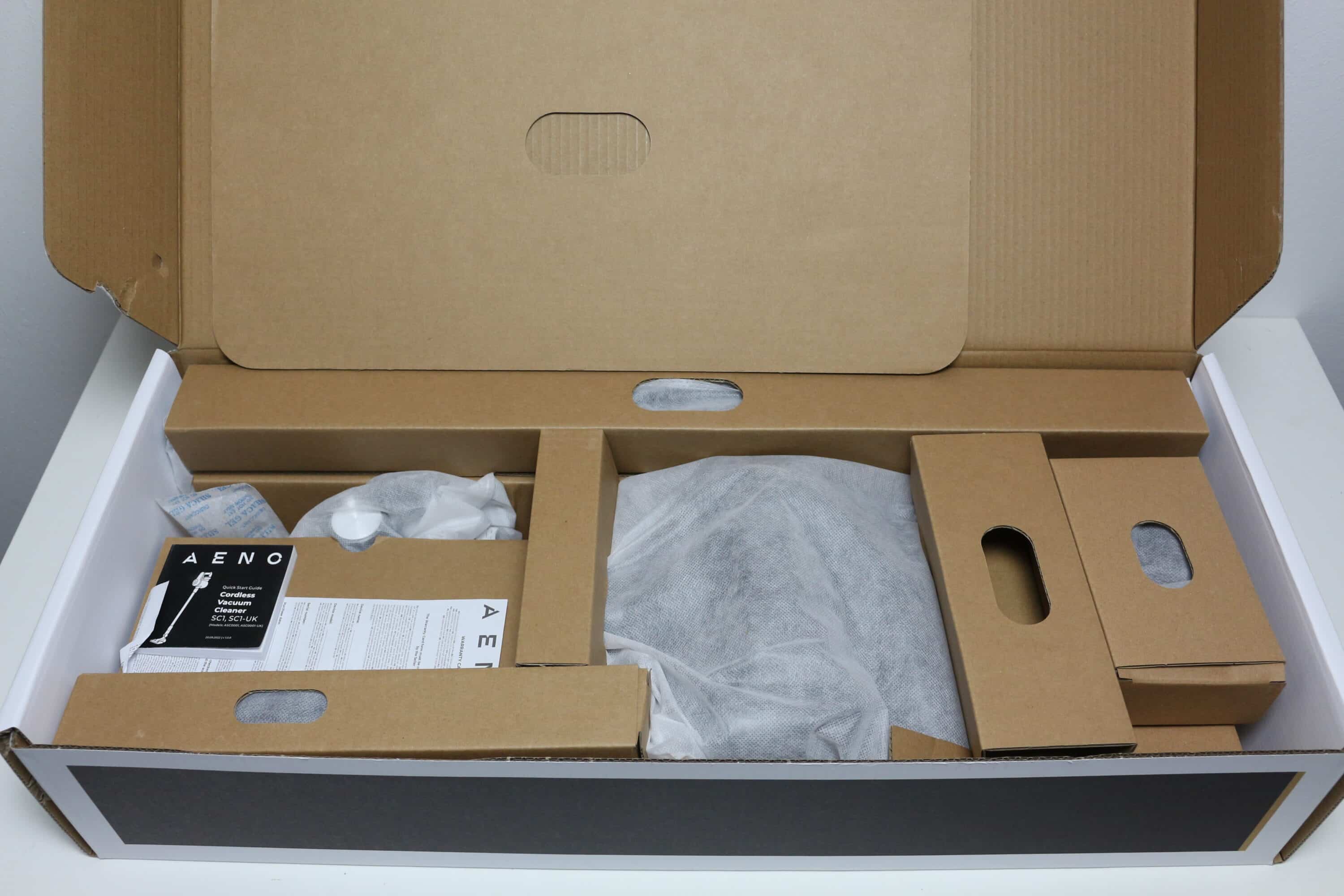 Im Inneren umhüllt AENO alle Bauteile mit Elementen aus Pappe und aus Liebe zur Umwelt verzichtet der Hersteller außerdem auch auf Kunststofffolien. Stattdessen setzt AENO auf Beutel aus einem dünnen Stoffgewebe. Zum Lieferumfang gehören der Bürstenkopf, das Staubsaugerrohr, die Handeinheit bestehend aus Griff, Akku, Staubbehälter und Motor, eine sehr kompakte Bedienungsanleitung, eine Wandhalterung inklusive Montagematerial, das Netzteil und zwei zusätzliche Staubsaugeraufsätze.