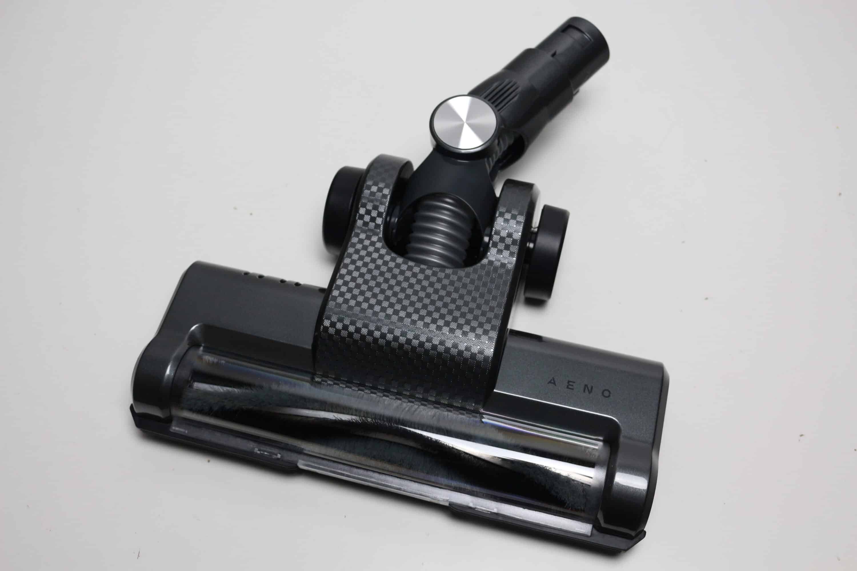 Auch der Bürstenkopf besteht vollständig aus einem blau-grauen Kunststoff. Das Mittelstück verfügt über eine große Fläche in Karbonfaseroptik. Weiterhin stattet AENO den Bürstenkopf mit zwei simplen Kunststoffrollen aus, die aber mit einer dünnen Schicht Gummi umhüllt wurden um für etwas mehr Laufruhe zu sorgen. Die motorisierte Turbobürste kann von oben über ein Sichtfenster betrachtet werden.