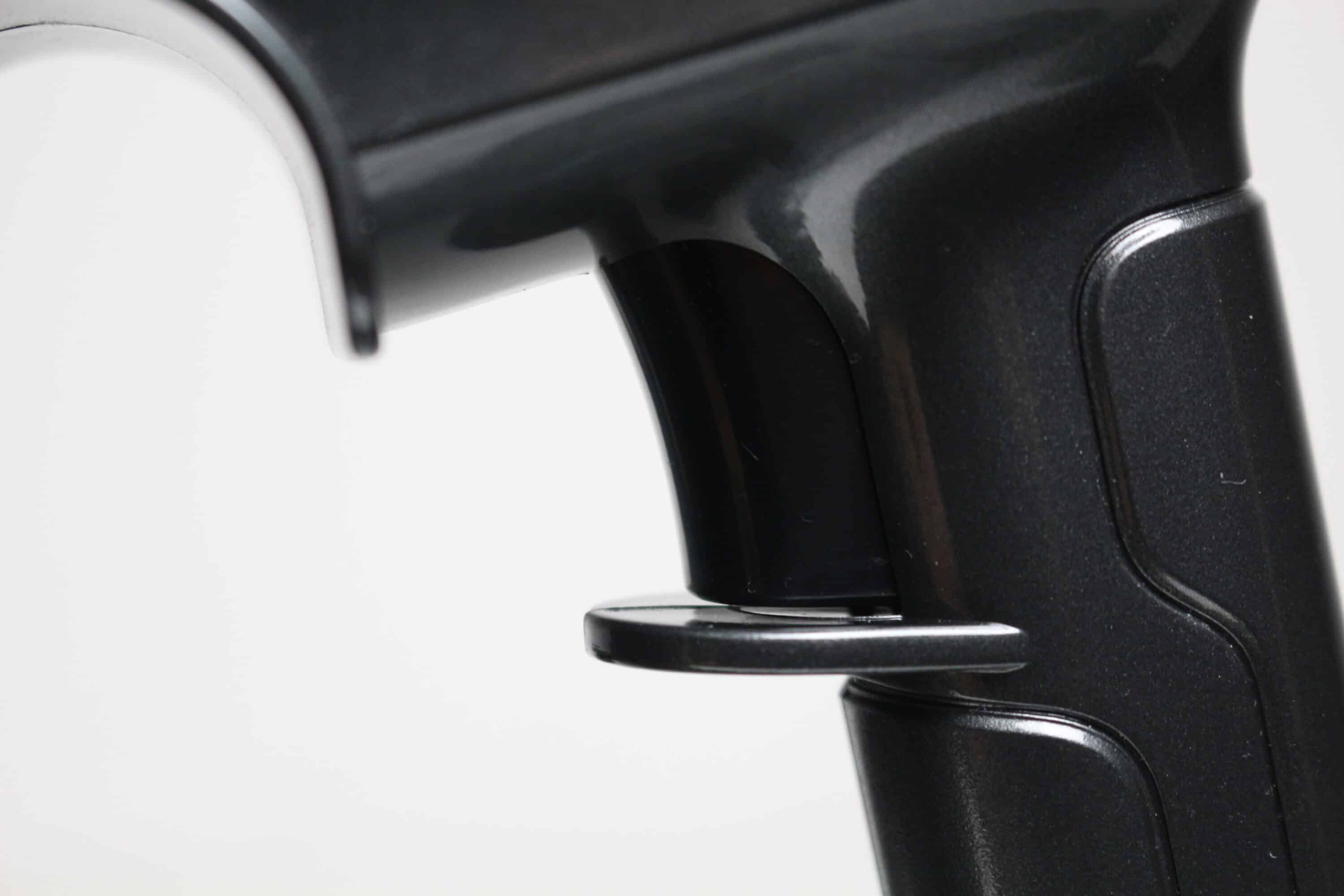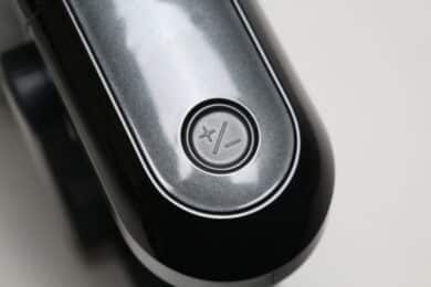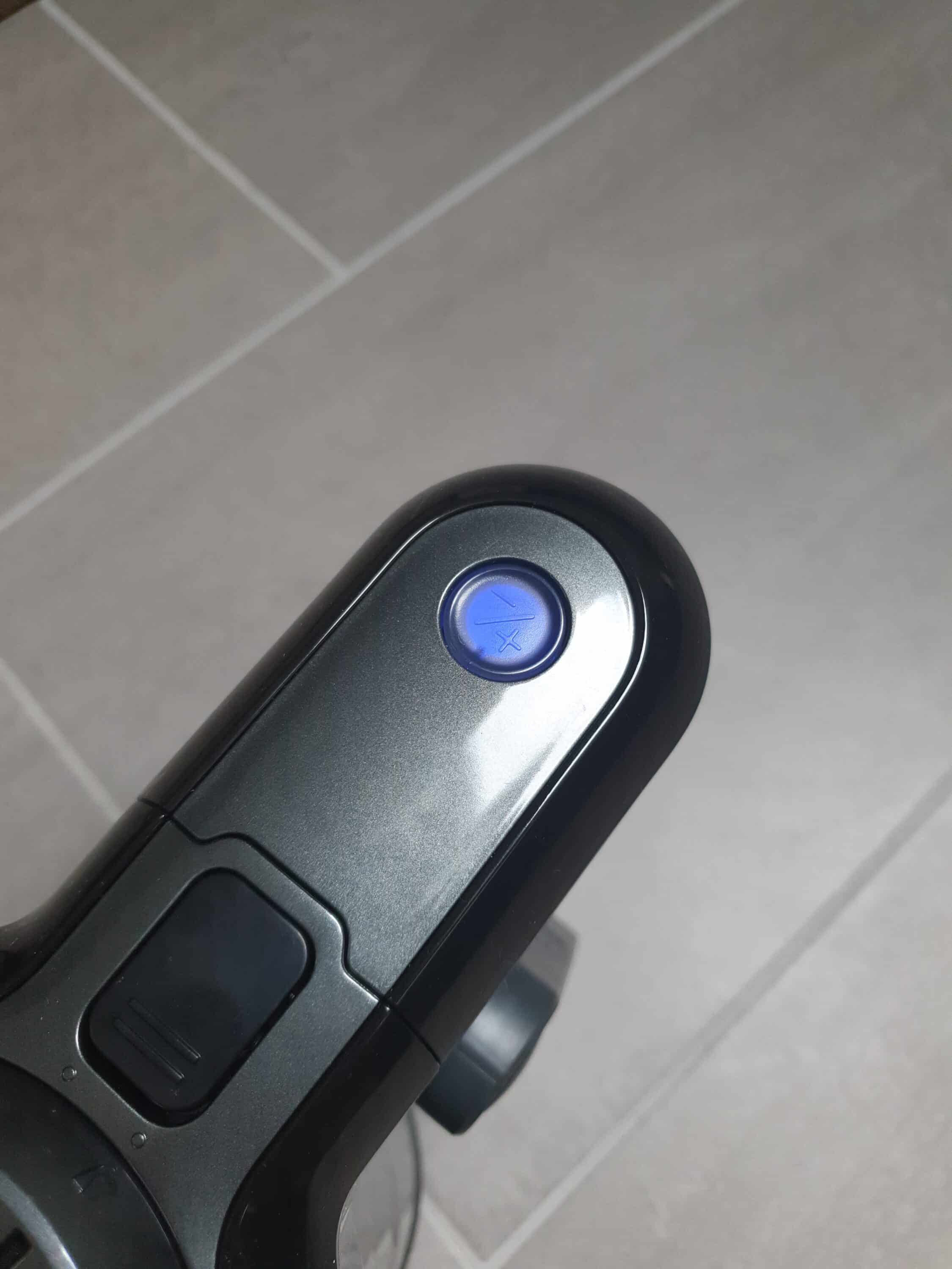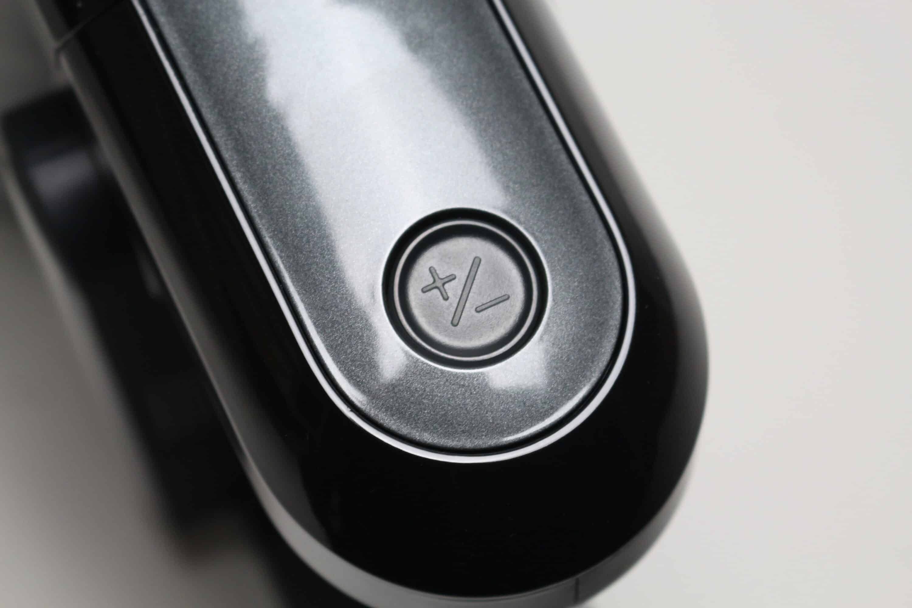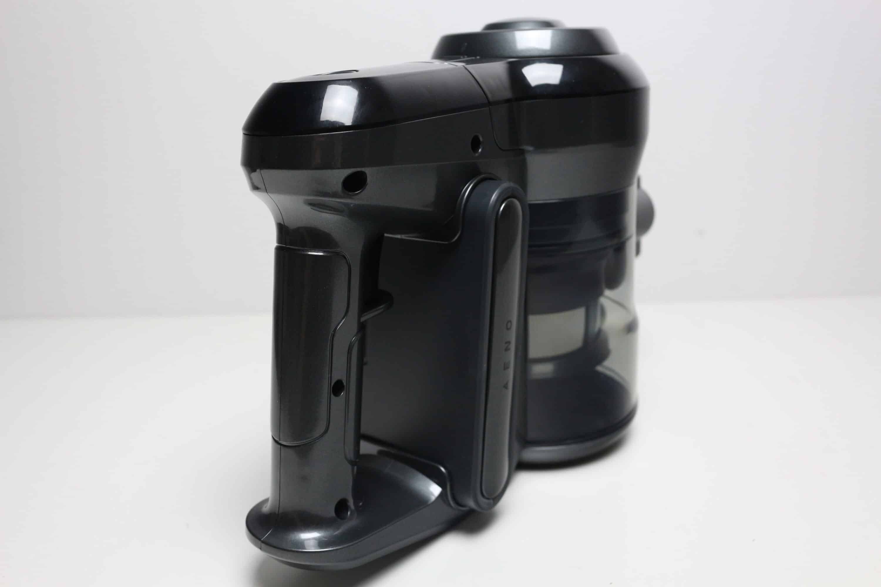 Die Bedienung des AENO SC1 erfolgt über zwei Schalter bzw. Knöpfe. Die Aktivierung des Staubsaugermotors erfolgt über den Taster am Handgriff. Drückt man diesen, dann geht der Staubsauger an und bleibt auch an. Das Halten des Schalters ist während des Reinigungsvorgangs also glücklicherweise nicht notwendig. Eine erneute Betätigung des Tasters schaltet den Staubsauger wieder aus.