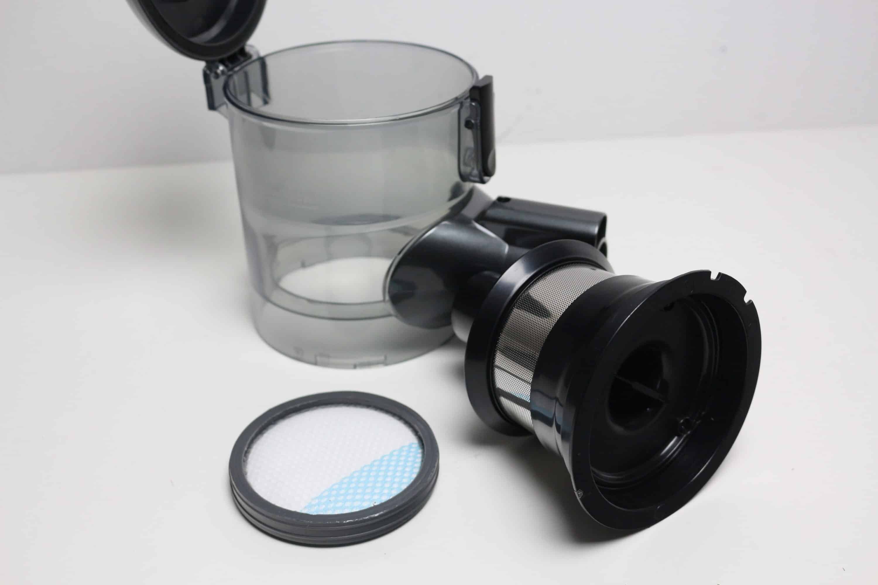 Möchte man die gesamte Filtereinheit reinigen, dann kann der Staubbehälter auch vollständig zerlegt und die einzelnen Bauteile bei Bedarf mit Wasser abgespült werden. Vor der nächsten Benutzung sollten die Bauteile aber vollständig getrocknet sein. Auch die Spiralbürste im Bürstenkopf lässt sich einfach ausbauen und reinigen.