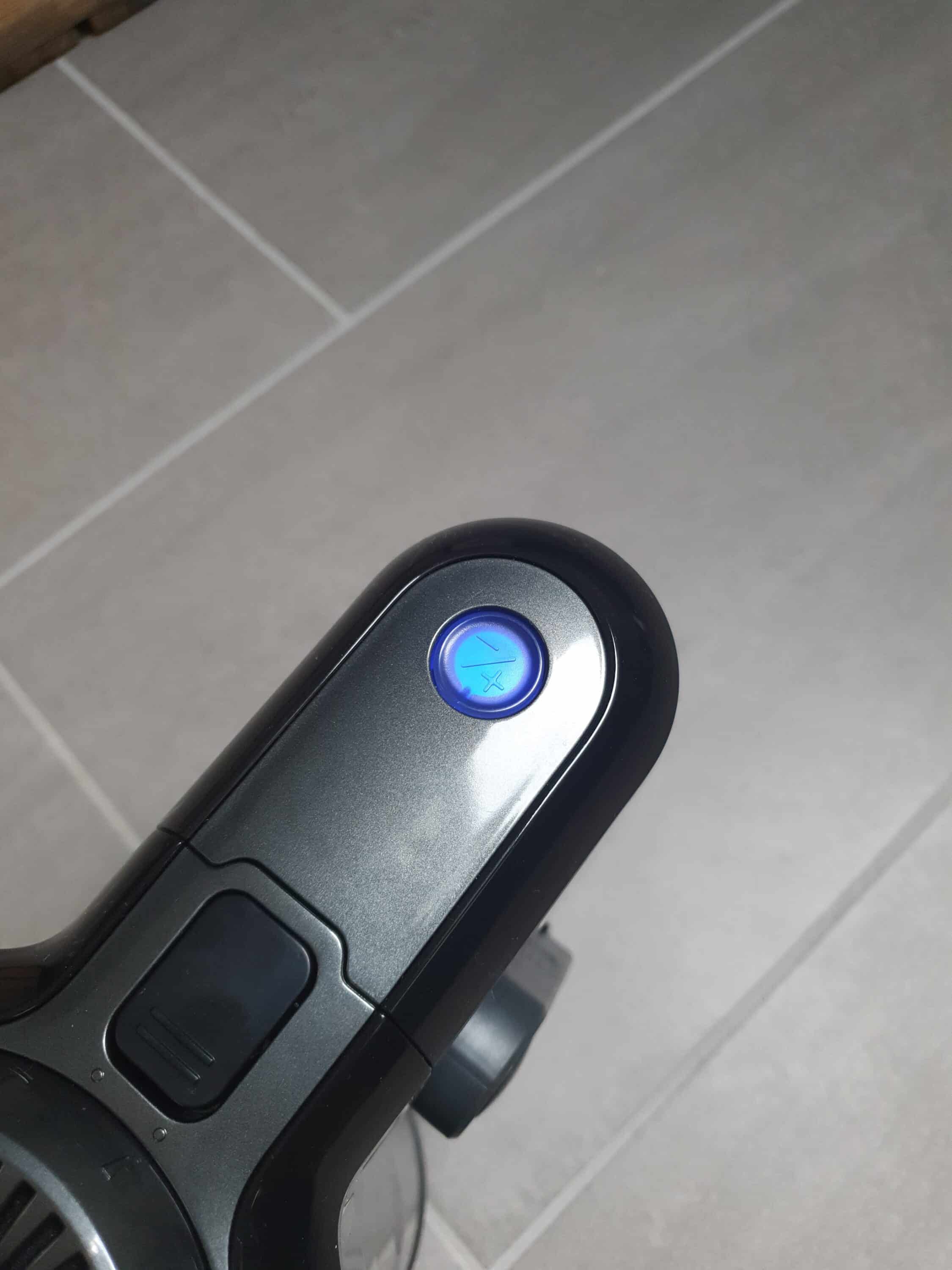 Über einen weiteren Knopf an der Oberseite lässt sich der Saugmodus einstellen. Zu Verfügung steht ein einfacher sowie ein Turbomodus. Anhand der Farbintensität der blauen LED unterhalb des Knopfes lässt sich erkennen, welcher Modus gerade aktiviert ist. Wenn der Akku fast leer ist, dann blinkt die LED außerdem rot.