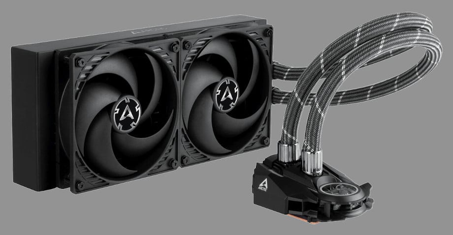 Das beim Vorgänger genutzte Push-Pull-Prinzip, bei dem vier 120 mm Lüfter auf einem 240 mm Radiator verbaut waren, hat Arctic beim Liquid Freezer II aufgegeben. Stattdessen kommt wie üblich nur ein Lüfter pro Radiatoreinheit zum Einsatz. Dafür verbaut Arctic nun einen zusätzlichen kleinen Lüfter auf der Pumpen- und Kühlereinheit im Gehäuse, um durch den zusätzliche Luftstrom auch die Spannungswandler des Prozessors zu kühlen.
