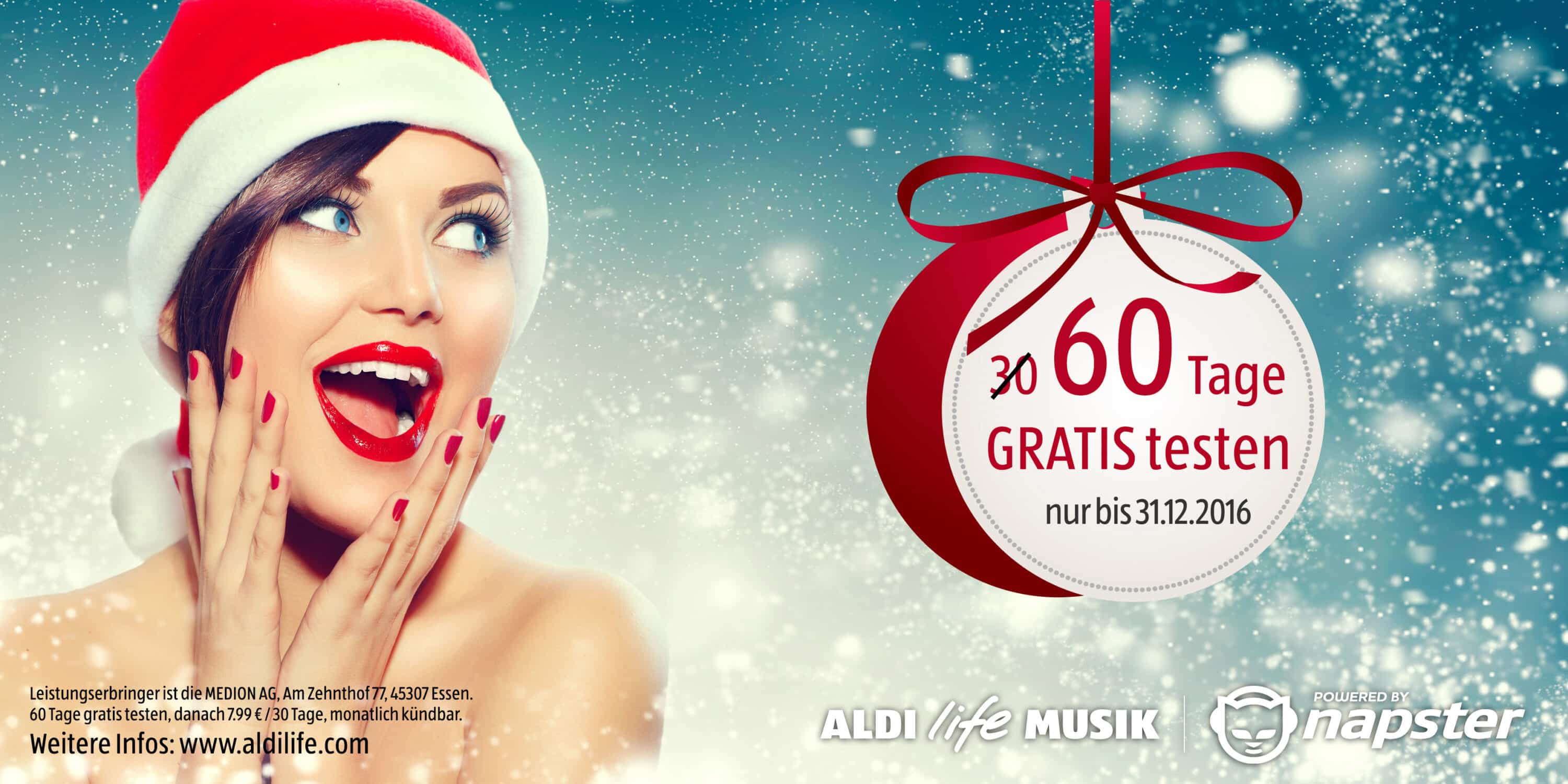 Zwischen dem 1. und 31. Dezember 2016 gilt die Aktion. Wer noch nicht auf Musik-Streaming setzt oder mit seinem bisherigen Dienst unzufrieden ist, sollte mal unter aldilife.com/christmas16 vorbeischauen.
