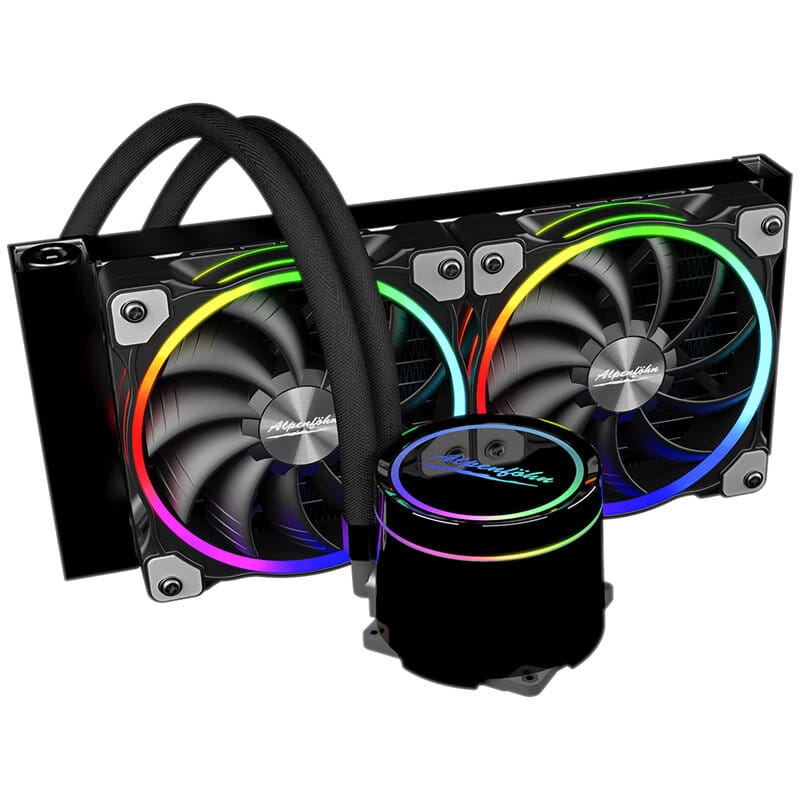 Beim Gletscherwasser von Alpenföhn kann man sich zwischen unterschiedlichen Modellen entscheiden. Beide kommen mit einer Tiefe von 27 Millimeter daher. Während die eine Komplettwasserkühlung einen Radiator mit 240 mm Größe bietet, kommt die andere mit einem größeren 360-mm-Radiator daher. Der Radiator besteht in beiden Fällen aus Aluminium. Die Gletscherwasser setzt bei der Pumpe auf ein zunehmend beliebter werdendes Design, welches auf zwei Kammern basiert. Im Modell mit kleinerem Radiator bietet Alpenföhn zwei Lüfter des Typs Wing Boost 3 ARGB. Wer sich für das größere Modell entscheidet, erhält gleich drei Lüfter des selben Typs. Die Lüfter bieten eine minimale Drehzahl von 500 Umdrehungen pro Minute. Wenn die Lüfter auf Hochtouren laufen, erreichen sie wiederum ein Maximum von 1.600 Umdrehungen pro Minute. Wem das noch immer nicht genügt, der sollte einmal einen Blick auf die High-Speed-Variante der Komplettwasserkühlung werfen. Hier erreichen die Lüfter bis zu 2.200 Umdrehungen pro Minute.