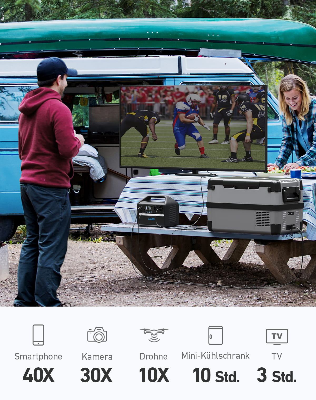 Maximal werden damit (kombiniert) bis zu 500 Watt Ausgangsleistung erreicht. Via USB-Type-C lassen sich Geräte mit maximal 60 Watt laden. Laut Herstellerangabe reicht die Akkukapazität aus, um Smartphones 40 mal, Drohnen bis zu 10 mal und Kameras 30 mal mit Energie zu versorgen. Ein TV-Gerät lässt sich damit drei Stunden lang mit Strom versorgen, ein WLAN-Router sogar bis zu 38 Stunden lang.