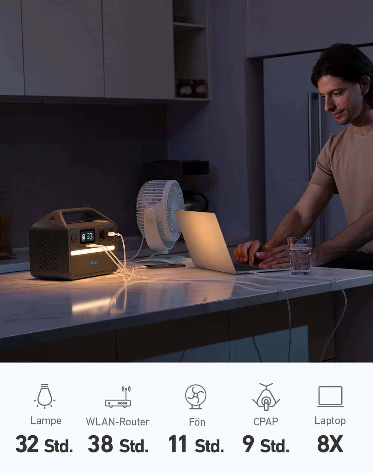 Praktisch für unterwegs: Das Anker 535 PowerHouse verfügt an der Frontpartie zudem über eine LED-Lichtleiste, die beim Camping für zusätzliche Beleuchtung mit einem angenehmen, warmen Licht sorgt.