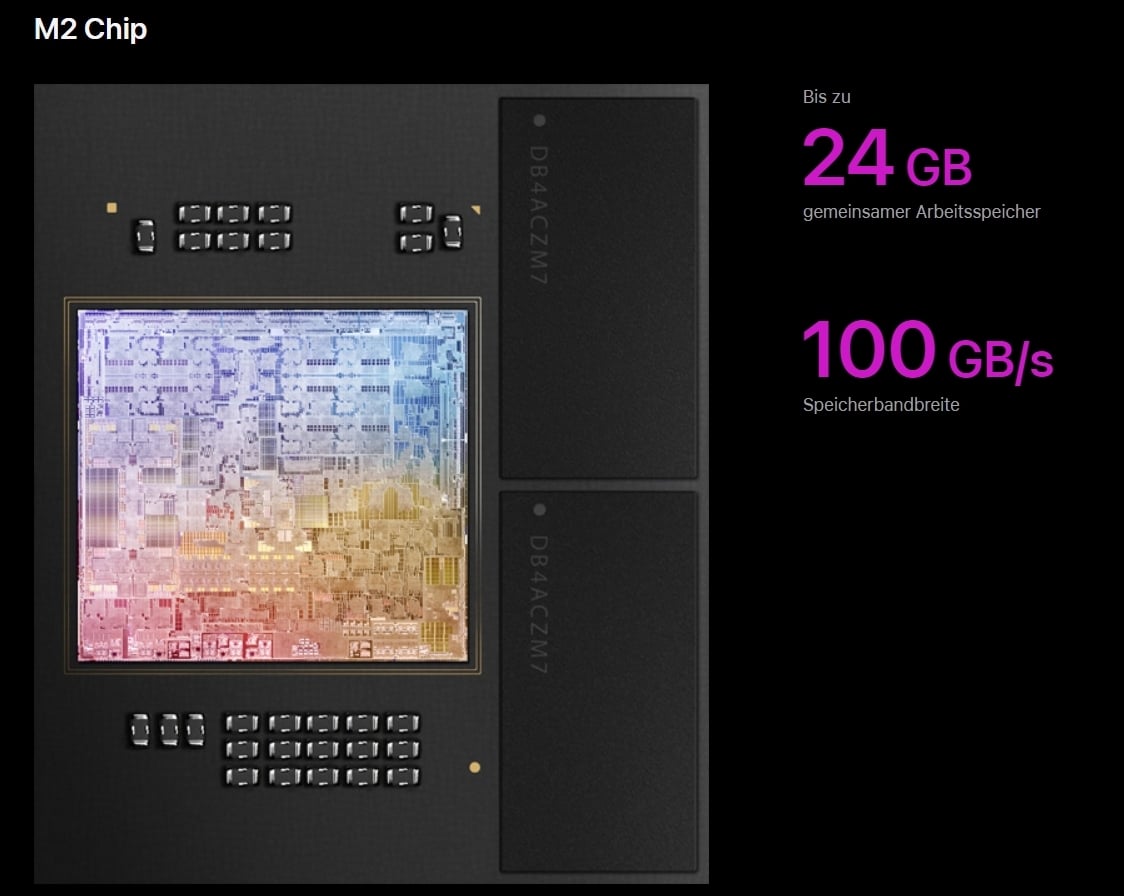 Dank der Transistoren erreicht der neue Chip eine Speicherbandbreite von 100 GB/s, 50 Prozent mehr als beim M1. Damit werden beim Apple M2 bis zu 24 GB LPDDR5 Arbeitsspeicher unterstützt, die mit hoher Bandbreite und niedriger Latenz für den gesamten Chip zur Verfügung stehen.