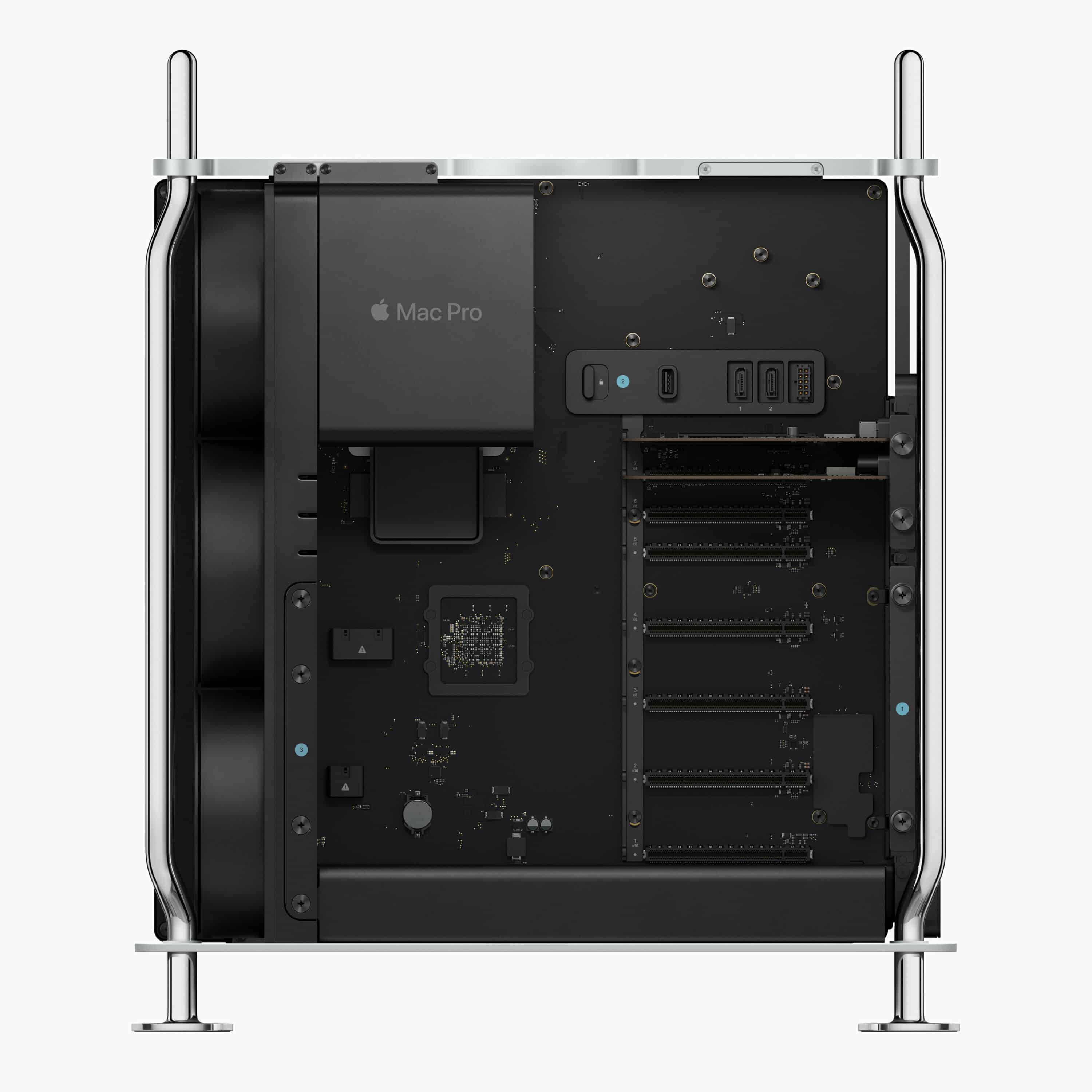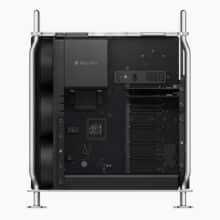 Laut Apple liefert die integrierte Media Engine des M2 Ultra die Leistung von sieben der zuvor angebotenen Afterburner-Karten für die Videobeschleunigung. Nutzer können weitere Karten in insgesamt sieben PCIe-Steckplätzen installieren, von denen sechs standardmäßig frei sind und einer belegt ist.
