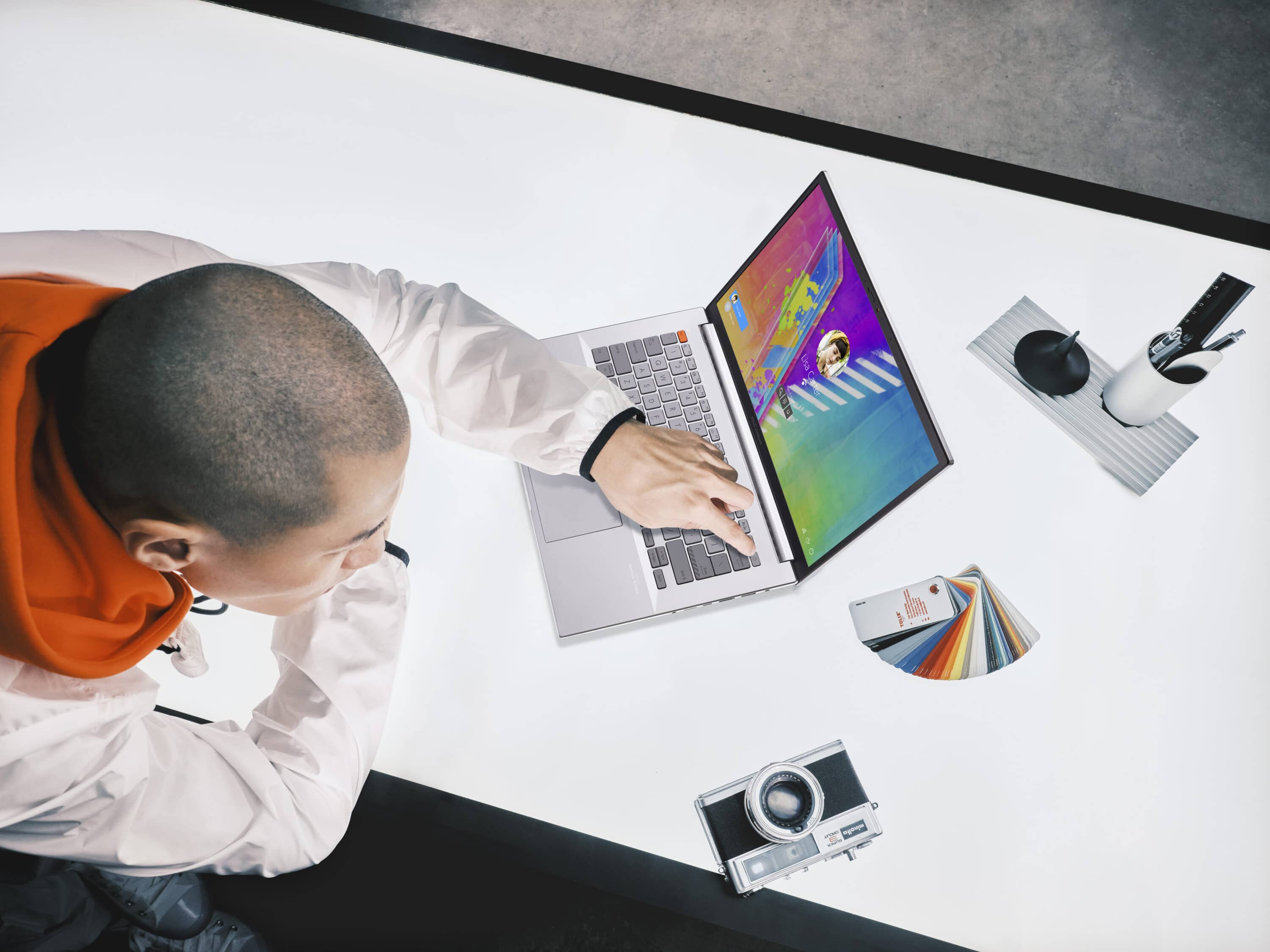 Soweit so gut. Doch abseits der tollen Hardware-Highlights soll der Vivobook Pro 16X OLED laut Asus auch weitere spannende Features auf Lager haben. Dabei betont der Tech-Konzern aus Taiwan das DialPad. Dieses soll vor allem für Content Creator einen einzigartigen Workflow gewährleisten. So lässt sich das Touchpad ganz individuell anpassen. Ein weiteres praktisches Feature ist der Fingerabdrucksensor, welcher sich in der Enter-Taste verbirgt. Content Creator werden sich außerdem über die diversen Anschlussmöglichkeiten freuen. Neben 1x USB-C 3.2 Gen.2 (Thunderbolt 4 nur beim 16X), gibts hier 1x USB-A 3.2 Gen.1, 2x USB-A 2.0, 1x HDMI 1.4, 1x AUX-Anschluss sowie einen MicroSD-Slot. Ein nerviges Dongle werden da wohl die wenigsten benötigen. Das Ganze verpackt Asus in einem erstaunlich schlanken Chassis. Dieses ist gerade einmal 18,9 mm hoch und wiegt nicht einmal 2 kg. Damit ist es trotz seiner 16 Zoll wohl erfreulich portabel. Portabilität wird außerdem durch 14 Stunden Akkulaufzeit gewährleistet, die Asus verspricht.