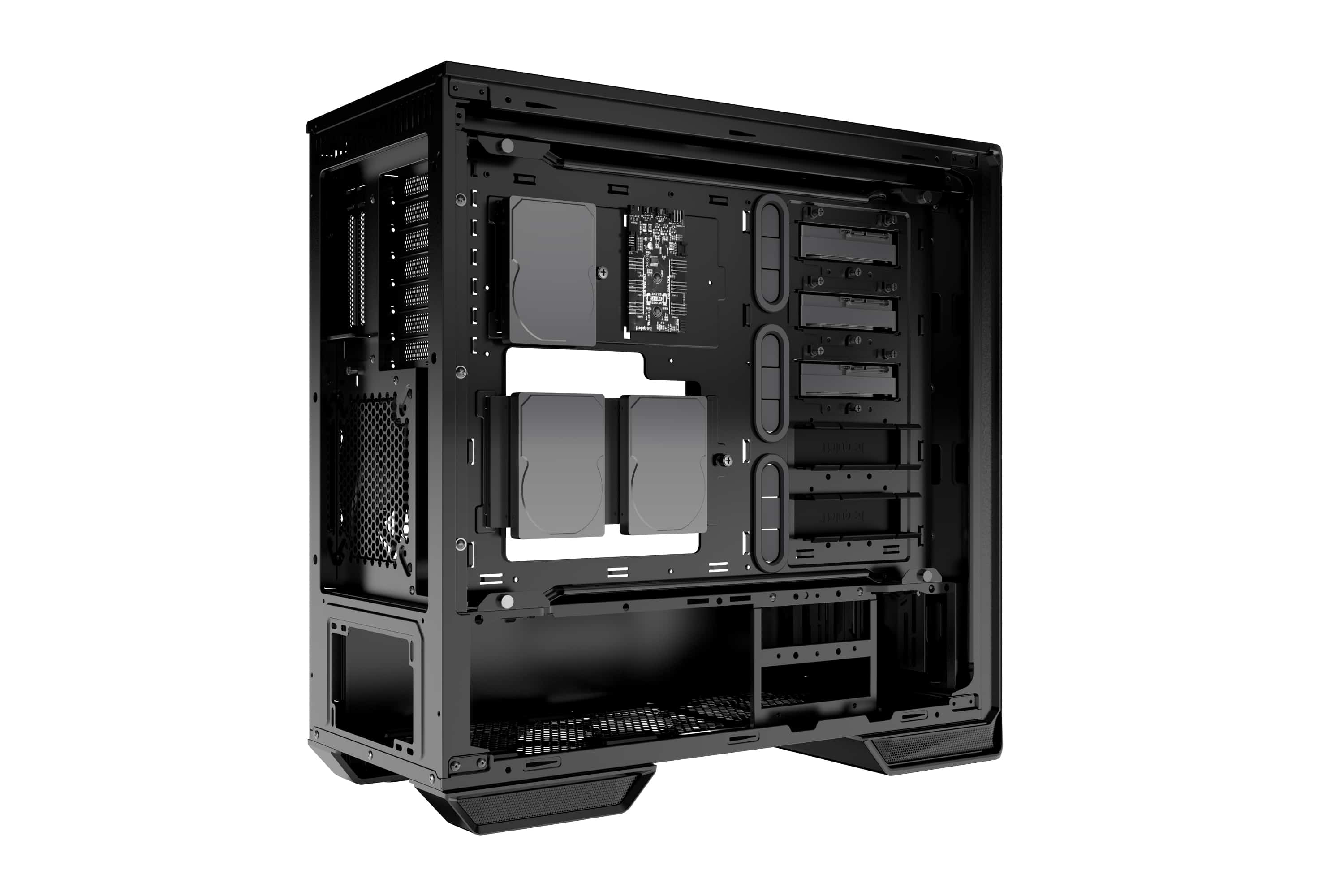 Im Dark Base 700 lassen sich sieben 3,5- oder siebzehn 2,5-Zoll-Laufwerke installieren. Durch ein aus Glas gefertigtes Seitenfenster wird ein Blick auf die Hardware ermöglicht. Das Netzteil des Geräts wird in einem separaten Bereich des Gehäuses untergebracht, der nicht einsehbar ist.