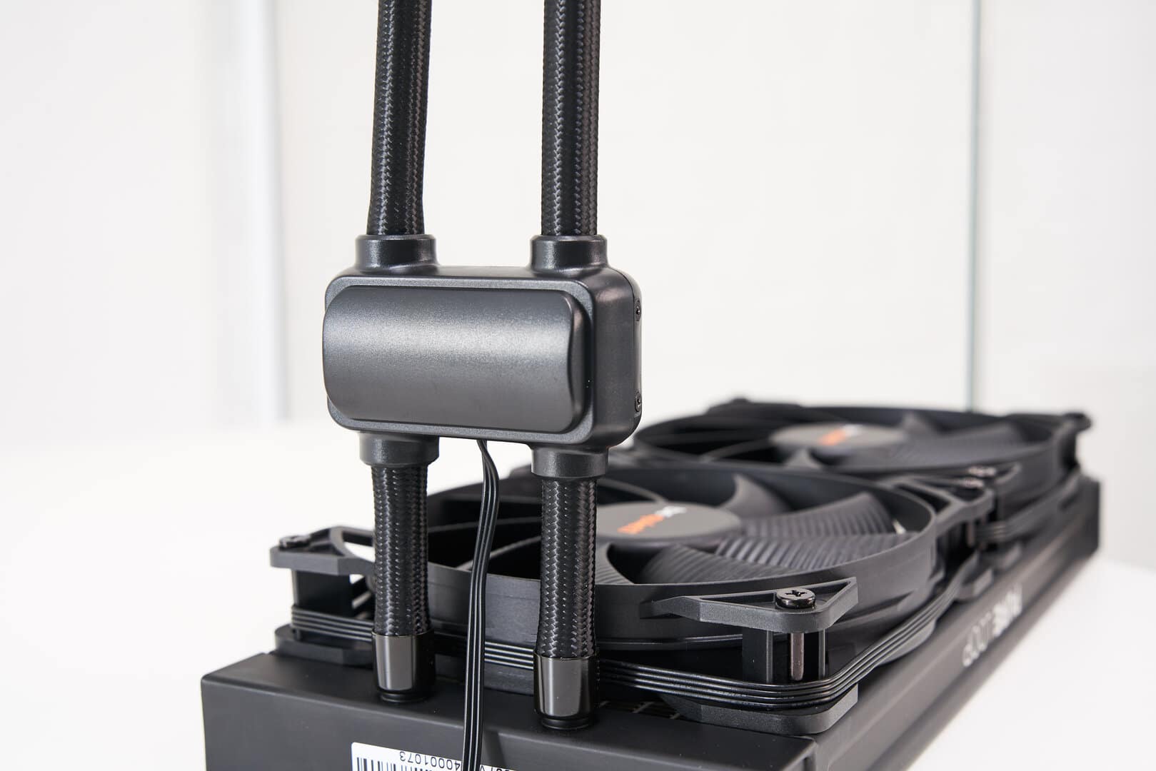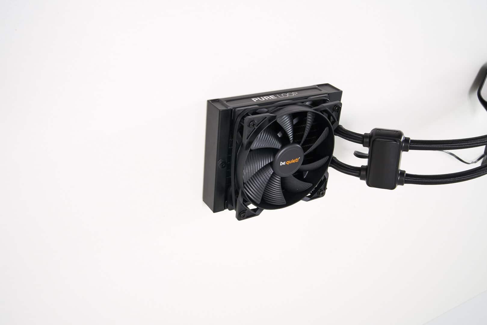 Um die Flüssigkeit des be quiet! Pure-Loop nachzufüllen, muss man den „Fillport“ nutzen, der sich direkt am Radiator befindet. Der Hersteller setzt bei seinen Kühlern auf das Prinzip einer zweifach entkoppelten Pumpe. Diese wurde sowohl vom Radiator als auch vom Kühlblock getrennt. Sie befindet sich in einem externen schwarzen Kunststoffbehälter. Fraglich ist, ob be quiet! bei der Funktionsweise der Pumpe ein wenig nachgeholfen hat. Schließlich kam es bei der eingestellten Silent-Loop Serie häufig zu Problemen mit selbiger. So soll sie beispielsweise durch störende Geräusche aufgefallen sein.