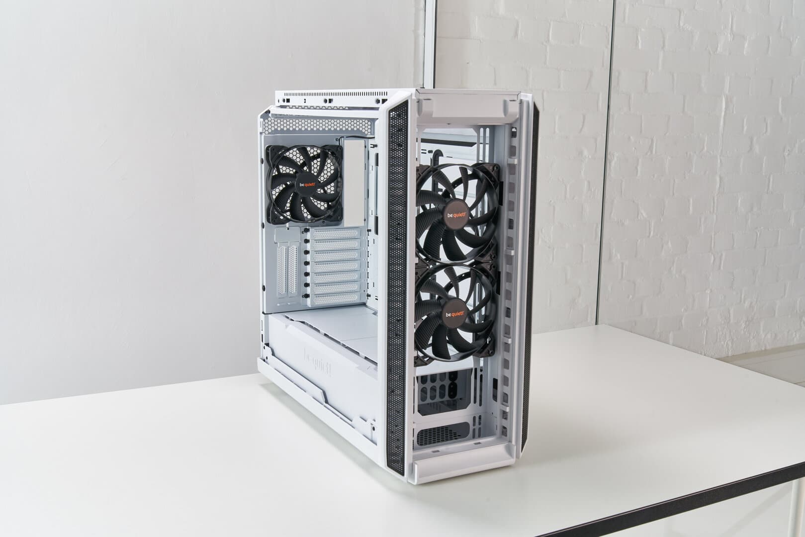 Das war es auch schon mit den Änderungen, die be quiet! beim Gehäuse vorgenommen hat. So setzt das Silent Base 802 ebenfalls auf die gleiche Lüftersteuerung. Hier sind maximal sechs 3-Pin-Lüfter möglich. Das I/O-Panel des Gehäuses ermöglicht eine praktische Steuerung des Lüfters. Mit einem Schiebeschalter kann man hier zwischen den verschiedenen Stufen hin und her schalten. Alternativ kann der Lüfter per PWM-Signal des Mainboards aktiviert werden. Zum Lieferumfang des Gehäuses gehören insgesamt drei Pure Wings 2 Lüfter (140 mm). Den Midi-Tower kann man sowohl auf der Oberseite als auch an der Front mit entsprechenden Lüftern nachrüsten. Im Gehäuse selbst kann man sogar einen Radiator bis zu einer Größe von 420 mm anbringen. Dieser findet direkt hinter der Front Platz. Einen Radiator kann man auch an der Oberseite einsetzen. Die praktische ausziehbare Halterung bietet Platz für Radiatoren mit 360 mm Durchmesser.