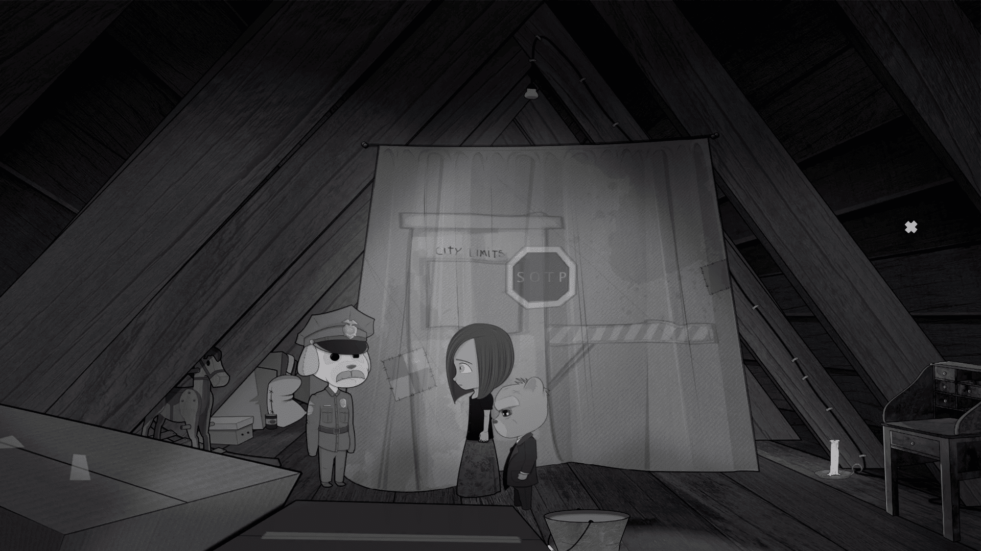 Der lakonische, leicht abgehalfterte Teddybär erinnert schnell an den Privatdetektiv Philip Marlowe aus den Romanen von Raymond Chandler. Die wenigen Farbakzente unterstreichen die Atmosphäre des Spiels und lassen Parallelen zu Frank Millers Comic „Sin City“ erkennen. Auch die eingeschobenen Sprachpanels unterstützen diesen Eindruck weiter und passen in das Gesamtbild. Neben der sehr stimmigen farblichen Gestaltung, trumpft das Spiel auch noch mit einem sehr passenden Spielsound.