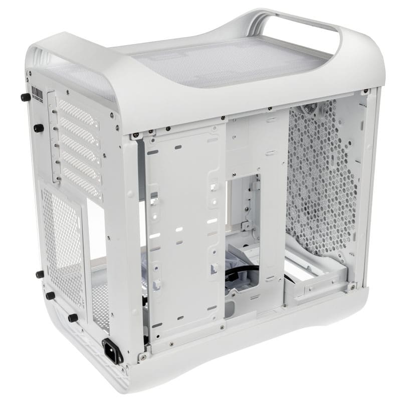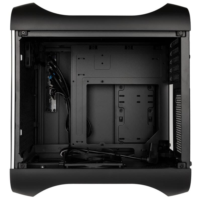 Der gesamte Innenraum ist innovativ gestaltet und wartet mit einem um 180 Grad gedrehten Mainboard-Tray auf. Das Mainboard selbst darf dabei maximal Micro-ATX Format haben, auch das Micro-ATX Format wird unterstützt. Dazu passend können auch große ATX Netzteile genutzt werden. Je nach installierter Hardware lassen sich bis zu sieben Lüfter unterschiedlicher Größen einbauen, an sechs Plätzen sogar Modelle mit einer Größe von 120 mm. Dank seiner Breite bietet das Prodigy M 2022 Platz für CPU Kühler bis 190 mm Höhe. Damit lassen sich auch massive Tower-Kühler in dem Gehäuse unterbringen.