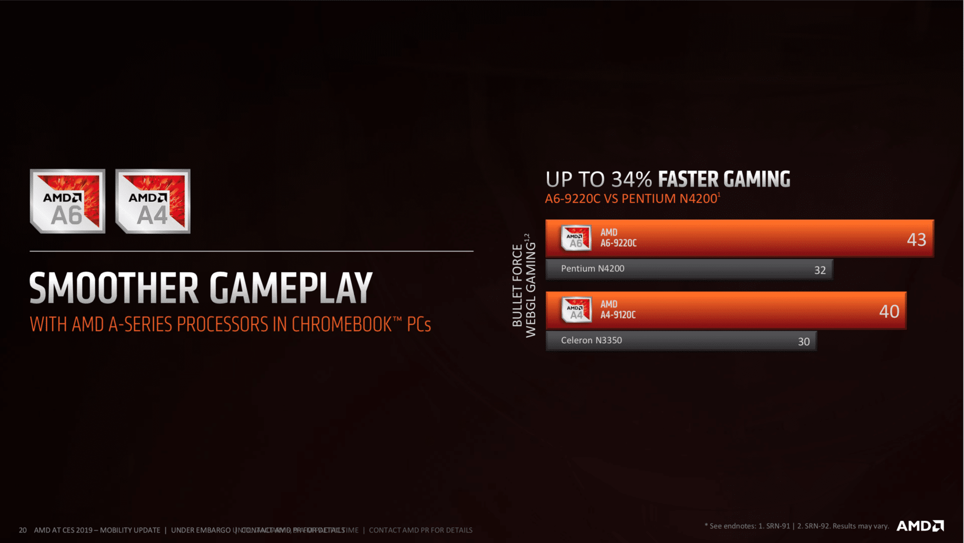 Neben den neuen Ryzen-Prozessoren hat AMD im Vorfeld des Consumer Electronics Show (CES) 2019 auch noch zwei neue Prozessoren für Google Chromebooks vorgestellt. Positioniert hat AMD die beiden neuen Prozessoren A4-9120C und A6-9220C gegen die Intel Pentium und Celeron SoCs. Technisch basieren beide „neuen“ Prozessoren auf der bereits 2016 erschienenen AMD Stoney-Ridge-Serie. Die Reduzierung des Stromverbrauchs von 15 Watt auf 6 Watt konnte aufgrund der alten Architektur jedoch nur durch eine deutliche Reduzierung der Taktrate und damit auch der Leistung erreicht werden. Zumindest beim Punkt Effizienz dürfte AMD damit deutlich gegen die technisch aktuelleren Intel-Prozessoren verlieren.