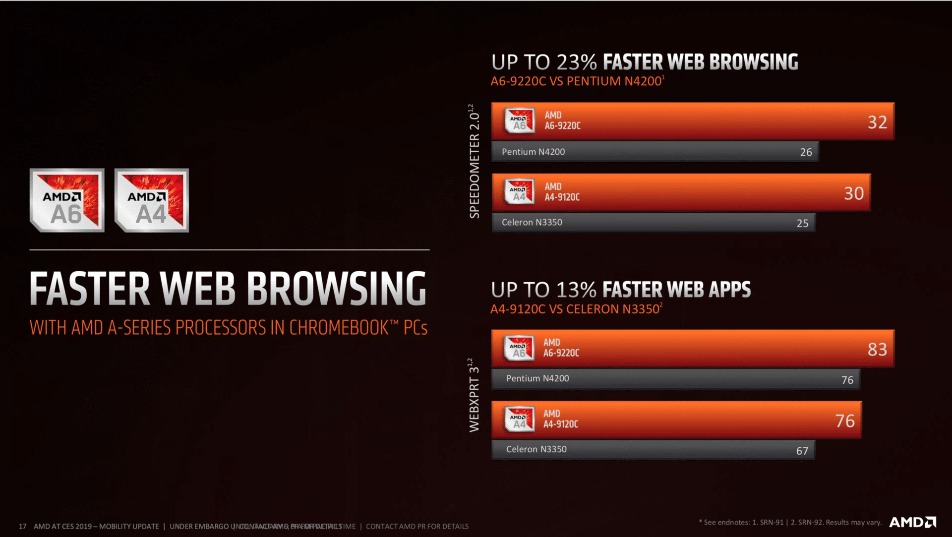 Leistungsmäßig soll die CPU laut AMD leicht über dem Niveau des Intel Celeron N3350 liegen. Die Effizienz und damit auch die Akkulaufzeit sollen beim Intel-Produkt jedoch deutlich besser ausfallen.