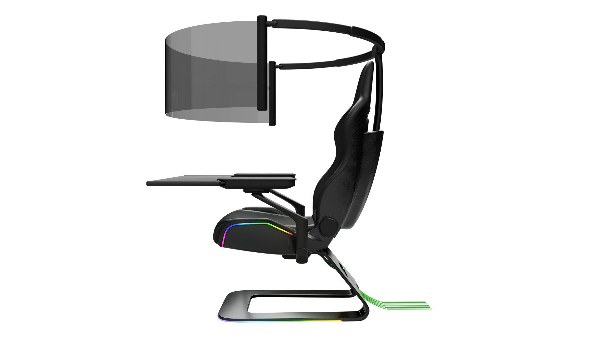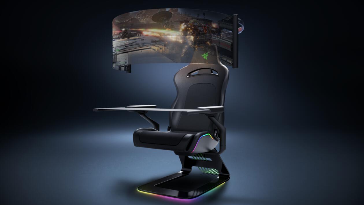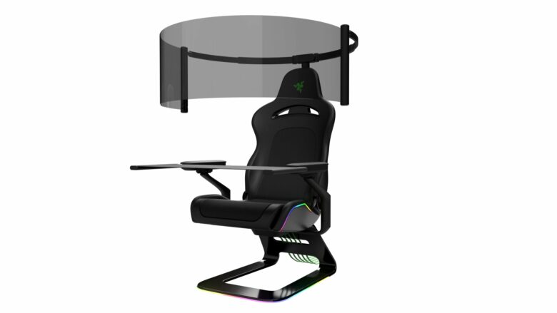 Die Kombination aus schierer Größe und dem gebogenen Design soll beim Spieler selbst für eine äußerst große Immersion sorgen. Von diesem beeindruckenden „Mittendrin-Gefühl“ sollen aber nicht nur Konsolen-Spieler profitieren können. Razer verbaut neben dem Display nämlich auch einen Tisch, der Platz für Maus und Tastatur bietet. Dieser versteckt sich wiederum in den Armlehnen des Stuhls. Hiermit zeigt Razer wohl ganz klar eine mögliche Zukunft des Gamings. Schließlich treffen immer größere Fernseher und Monitore auf immer kleiner werdende Wohnräume. Mit einer Gaming-Station, die sich im Inneren eines Stuhls versteckt, kann man selbst auf kleinstem Raum ein riesiges Gaming-Setup nutzen.