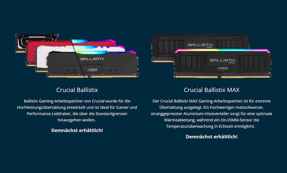 Der gezeigte Arbeitsspeicher ist den Serien Ballistix und Ballistix Max zugeordnet. Außerdem gibt es beide Serien mit RGB-Beleuchtung. Die Ballistix-Serie richtet sich dabei an durchschnittliche Interessierte, deren Hardware nicht im High-End-Bereich mithalten, dafür jedoch zu erschwinglichen Preisen erhältlich sein soll. Die Geschwindigkeit dieses Arbeitsspeichers liegt bei maximal 3.600 MHz bei CL16. Angeboten werden soll der RAM-Speicher in den Größen 8 und 16 GB. Darüber hinaus will Crucial auch einen 32 GB fassenden Speicher anbieten, der jedoch geringer getaktet sein soll. Die RGB-Serie soll sich alleine durch die Beleuchtung von der Standard-Serie unterscheiden.