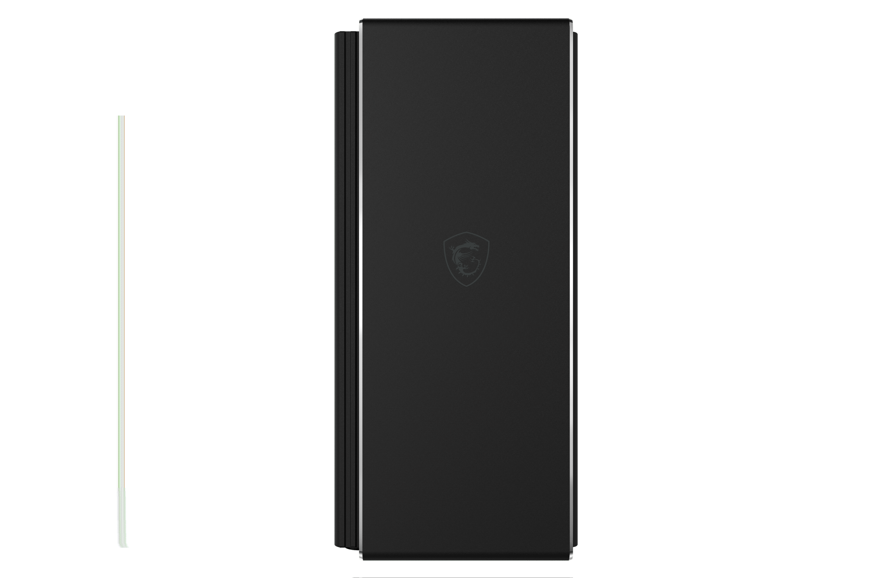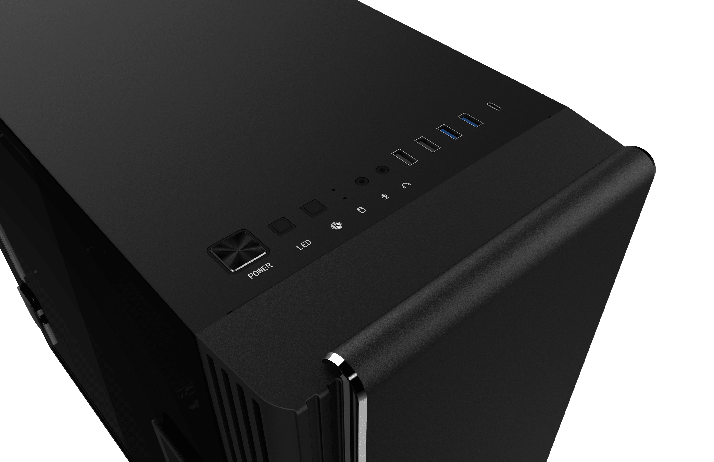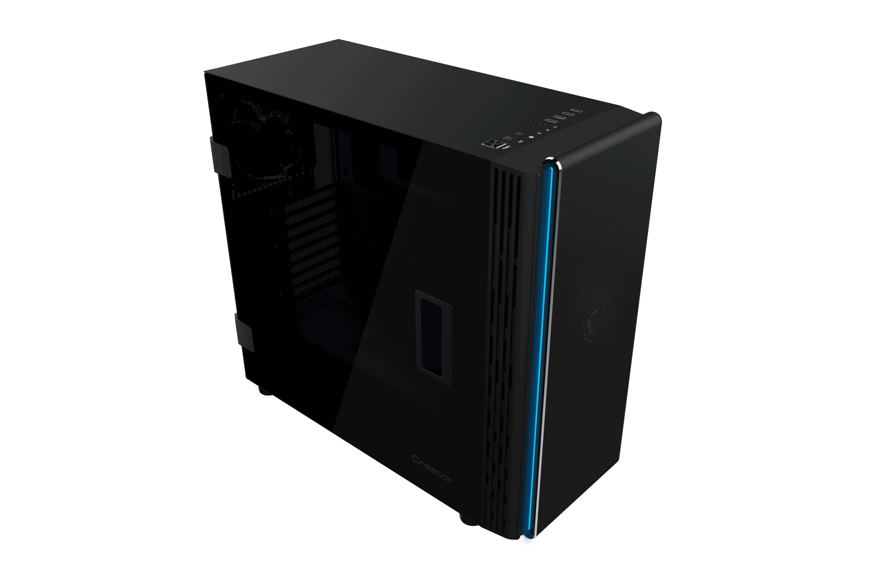 Weiterhin fällt außerdem die aerodynamische Formgebung der Front, die größtenteils aus Aluminium gestaltet ist, auf. In der Front und an der Rückseite sind insgesamt drei je 140 Millimeter große Lüfter eingelassen, die – auch aufgrund des Frontdesigns – für einen optimalen Luftstrom im Inneren des Gehäuses sorgen. So kann die verbaute Hardware ideal gekühlt werden.