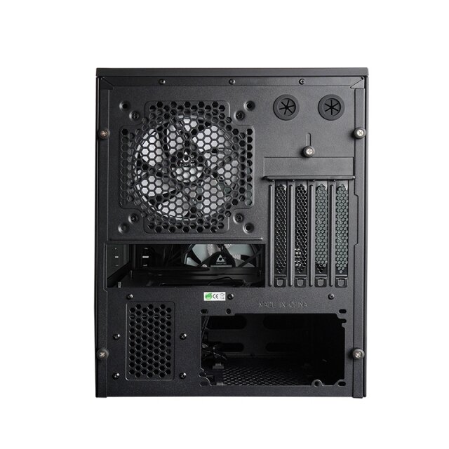 Anschlussseitig hat das Chrieftronic M2 zwei USB 3.0 (USB 3.2 Gen 1), zwei USB 2.0 und einen HD-Audio-Anschluss. Bei den Maßen liegt das Micro-ATX-Gehäuse bei 398 × 273 × 355 mm (L × B × H) und hat damit ein Gesamtvolumen von 38,57 Litern.