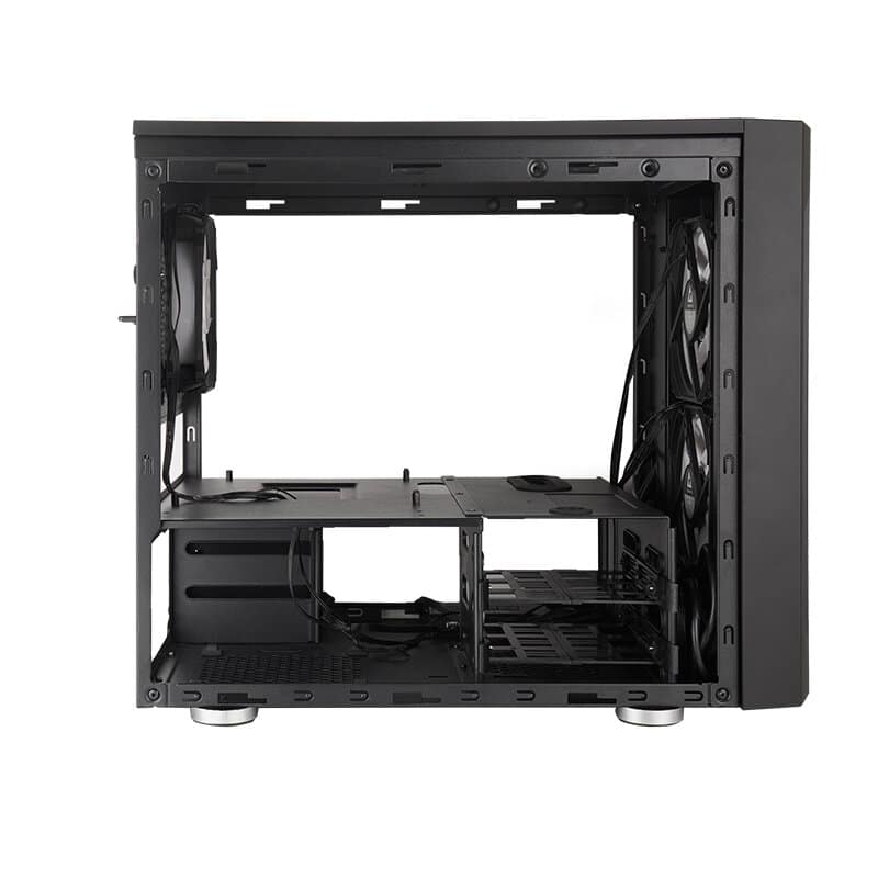 Das Grundgerüst des Chieftronic belässt Chieftec wie gehabt, so verteilt sich die Hardware weiterhin auf zwei Ebenen innerhalb des Micro-ATX-Gehäuses. Dabei sitzen das Netzteil und HDDs im unteren Bereich und darüber wird das Mainboard horizontal platziert. Was Kühlung und Grafikkarten angeht, ist im M2 eine Menge Platz vorhanden, so dass diese in unbegrenzter Größe genutzt werden können. Hier überschreitet im Moment keine erhältliche Hardware die Einbaumöglichkeiten des Chieftronic M2. Dennoch sieht es nach einer Begrenzung in der Höhe für den CPU-Kühler aus, hier sind maximal 175 mm möglich. Dies kommt durch die Lage des Lüfters unterhalb des Deckels. Verwendet man einen normalen Lüfter verbleiben hier 150 mm und bei einem Slim-Lüfter hat man noch 160 mm zur Verfügung.