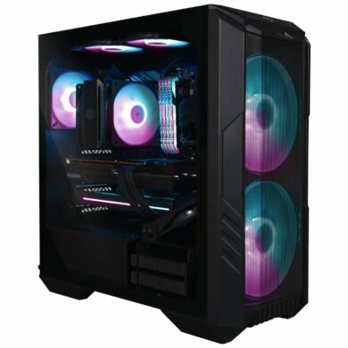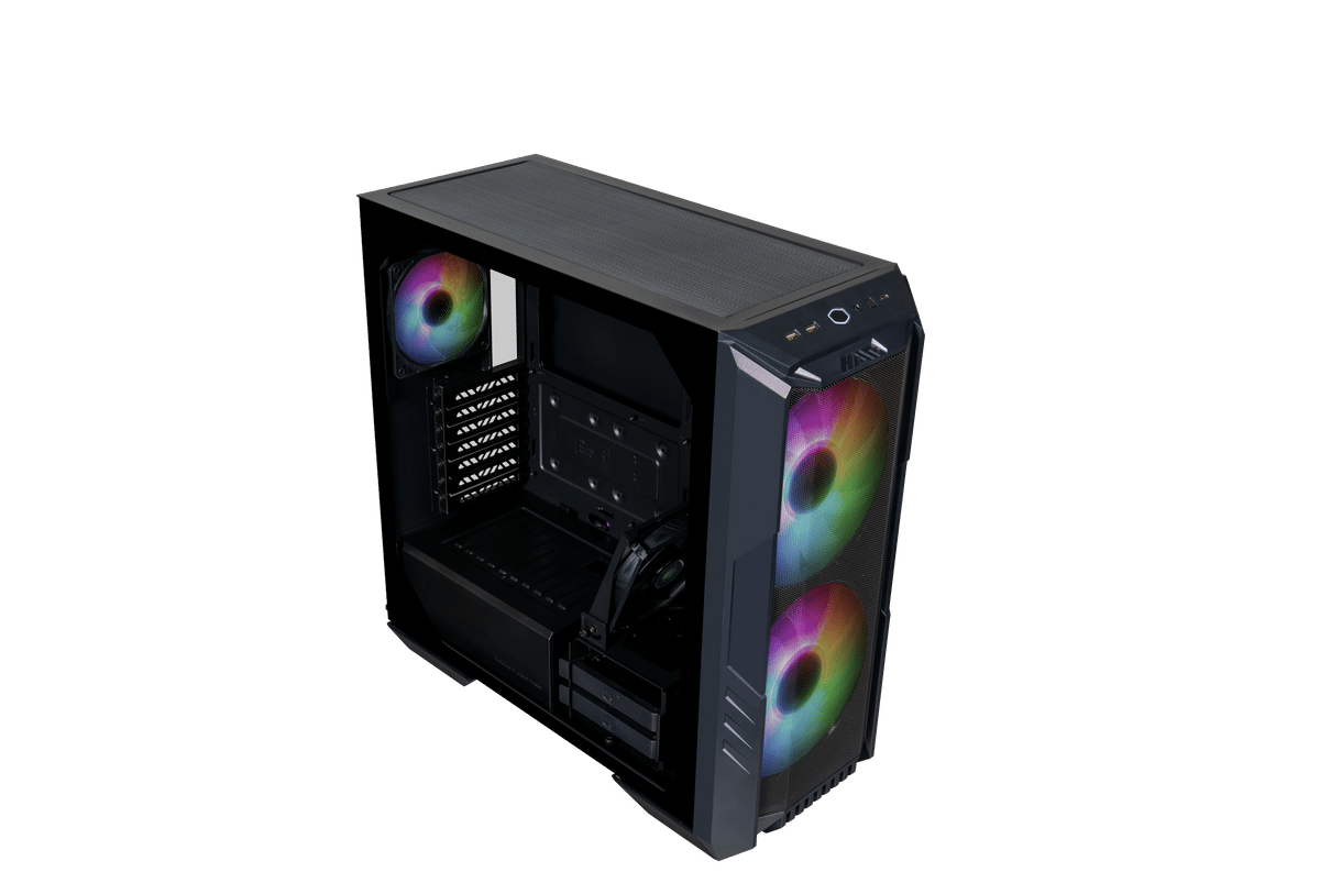 Wie beim HAF 500 hat Cooler Master offensichtlich auch hier darauf geachtet, es so benutzerfreundlich wie möglich zu gestalten. So kann man ebenfalls die Abdeckung abnehmen, um Änderungen an der Hardware vorzunehmen. Die dabei eingebauten Lüfter profitieren im mATX-Gehäuse von der Mesh-Front, welche für eine gute Durchlüftung sorgen soll. Auch hier legt Cooler Master direkt einen Sickleflow-Lüfter bei, der mit seinen RGB-Elementen auftrumpfen möchte.