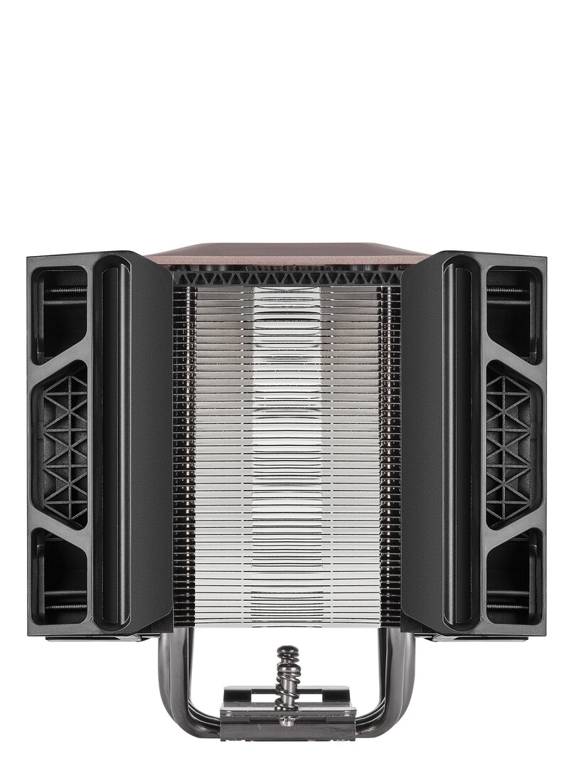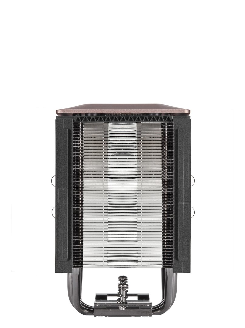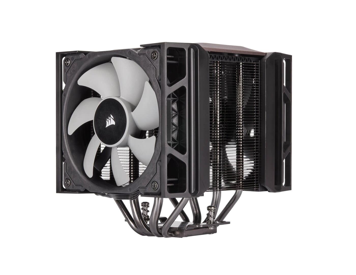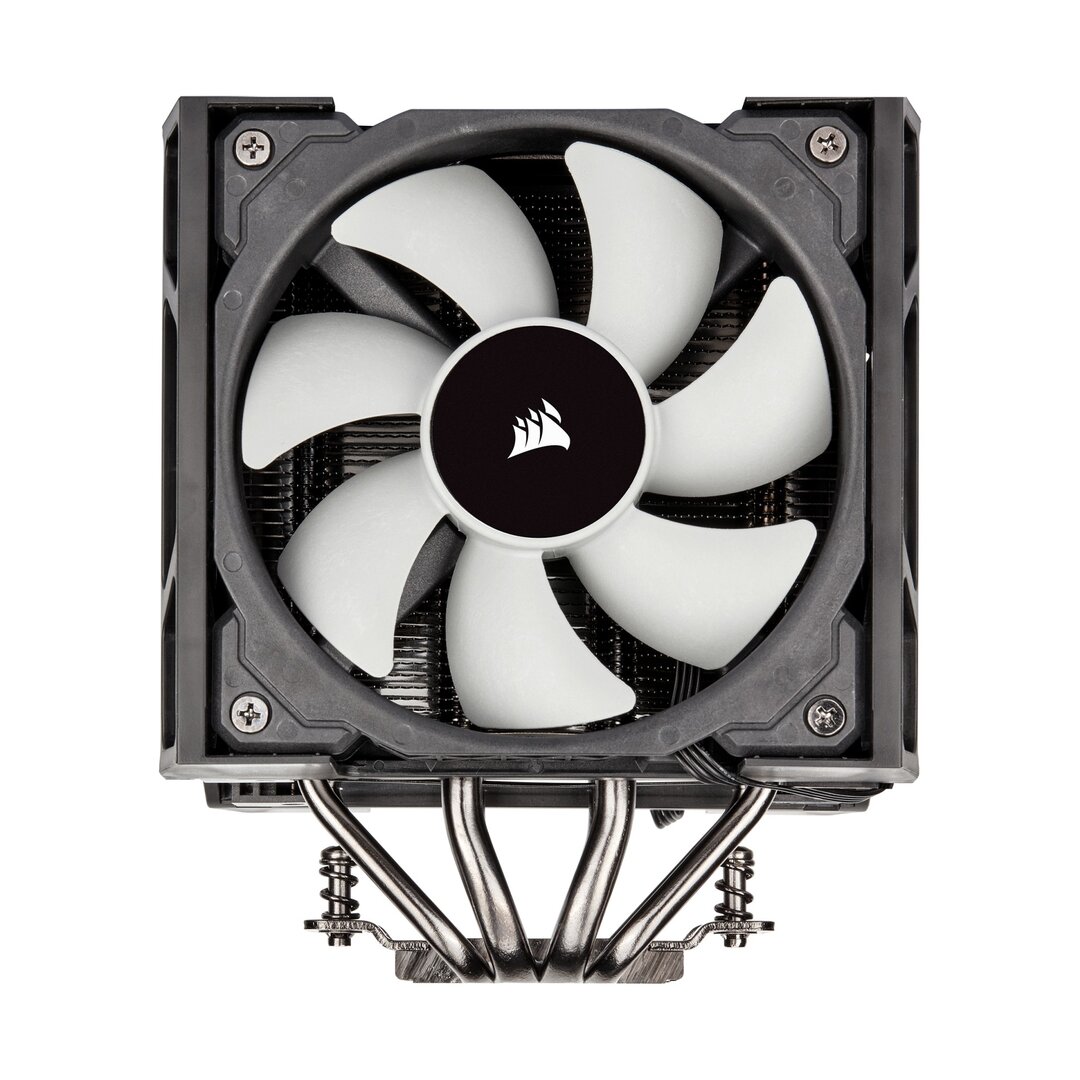 Die Leistungsdaten des Corsair A500 lassen auf eine gute Luftkühlung hoffen: Laut Herstellerangaben sollen damit Prozessoren mit einer TDP von bis zu 250 Watt gekühlt werden. Dazu tragen vier vernickelte Kupfer-Heatpipes bei – Durchmesser der äußeren Heastpipes liegt bei 6 mm, bei den Inneren bei 8 mm – die direkten Kontakt zum Prozessor über die Bodenplatte haben. Die Lamellen bestehen aus vernickeltem Aluminium. Die Kühlleistung reicht somit für CPUs der Intel-Sockel LGA 115x, 2011(-3) sowie AMD FM1, FM2, AM3 und AM4. Für AMD Threadripper auf Sockel TR4 oder TRX4 empfiehlt Corsair eine leistungsfähigere AiO-Wasserkühlung.
