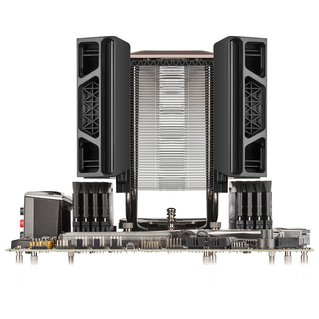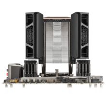 Das Gewicht des hohen Corsair A500 liegt bei 1,482 kg und die Abmessungen betragen inklusive der zwei 120-mm-Lüfter 137 mm Länge x 143,5 mm Breite x 168,7 mm Höhe. Aufgrund dieser großen Dimensionen müsste es eigentlich zu Inkompatibilitäten zu einigen RAM-Riegeln kommen, doch diese finden durch raffinierte Technik dennoch Platz: So lassen sich die zwei Lüfter über Schienen in der Höhe individuell verstellen, wodurch dann natürlich auch die Gesamthöhe des Lüfters über die 17 cm steigt. Die zwei 4-Pin-PMW-Kühler vom Typ ML120 haben ein Magnetschwebelager und laufen mit einer Drehzahl von 400 bis 2.400 Umdrehungen pro Minute.