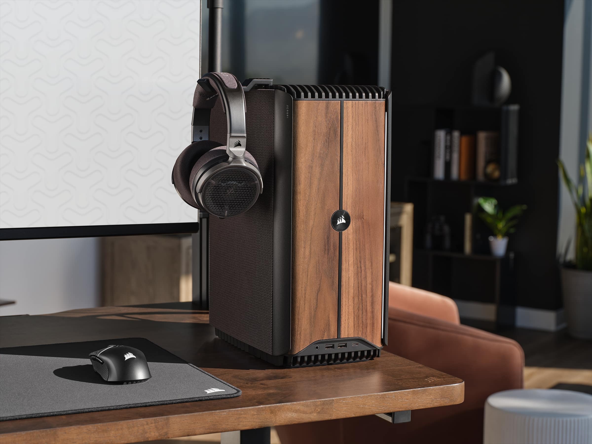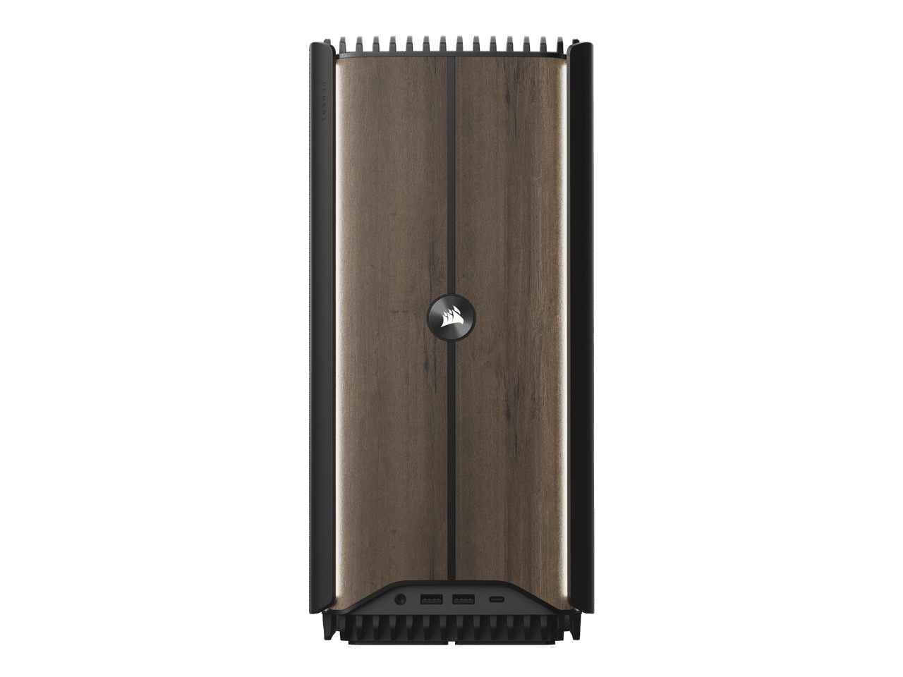 Demnach entfernt sich Corsair mit dem neuen Modell des Gaming-PCs vom kompakten 12-Liter-Gehäuse und bietet einen klassischen Tower mit einem Volumen von 22 Litern an, das an der Front auf eine Holz-Optik setzt. Dieses zeigt in der Mitte das Corsair-Logo, das beleuchtet ist und von zwei Leuchtstreifen eingerahmt wird.