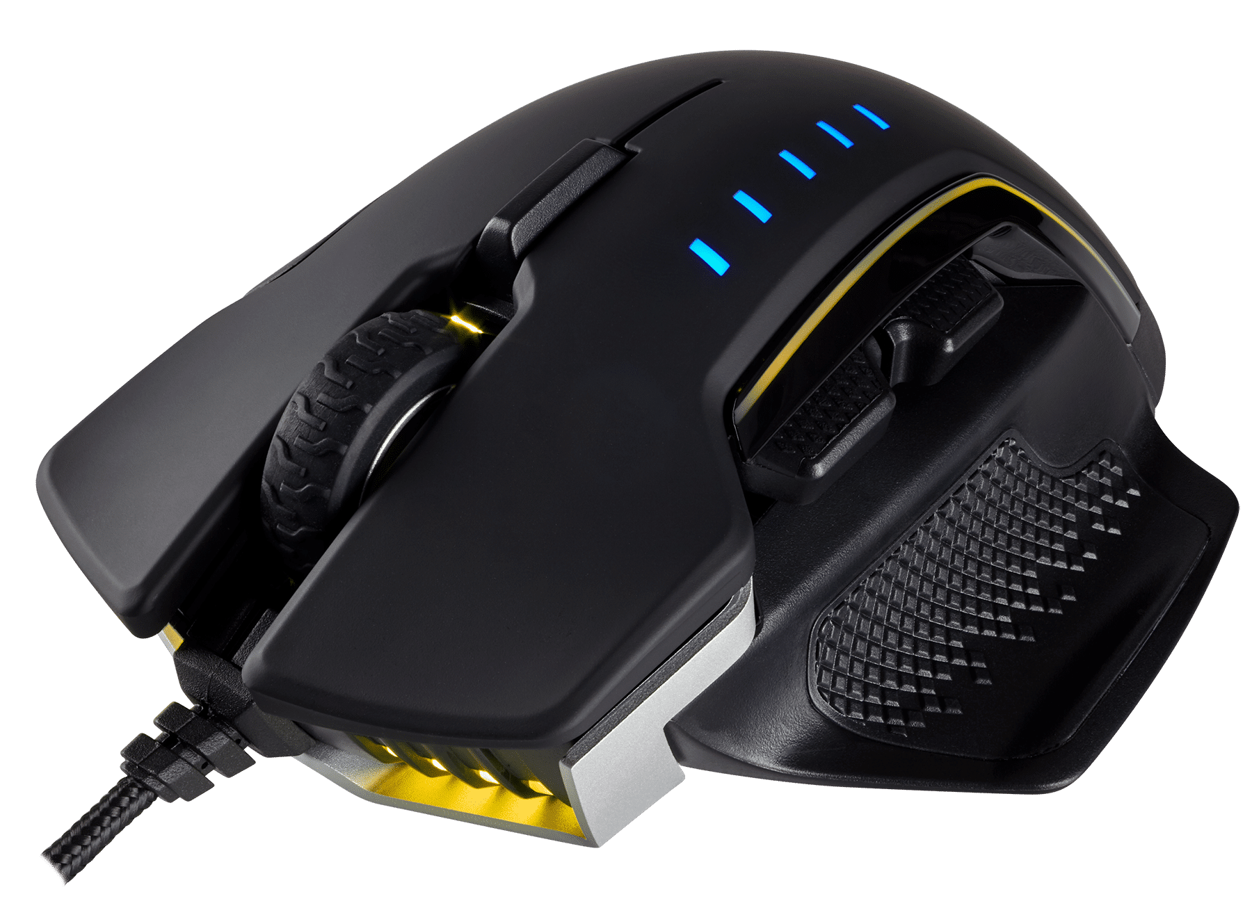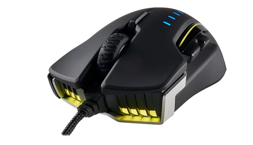 Über die Omron-Switches sind die Haupttasten auf 50 Millionen Betätigungen ausgelegt. Weiterhin sind die Funktionen wie DPI-Anzeige oder On-The-Fly-DPI-Wechsel enthalten. Zusätzlich verfügt die Gaming-Mouse über sechs programmierbare Tasten die über die CUE-Software belegt werden können, ein Aluminium-Scrollrad und eine RGB-LED-Beleuchtung. Die Beleuchtung kann über drei Zonen angepasst werden.