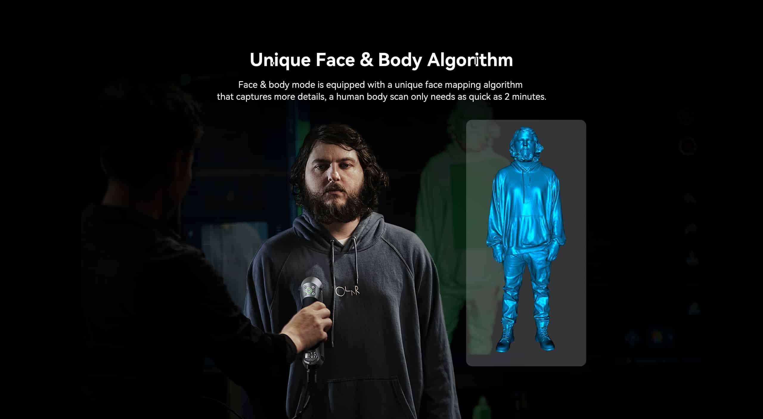 Der CR-Scan Raptor nutzt dafür die Speckle-Matching-3D-Bildgebung. Für voll funktionale Stücke sind dabei keine Markierungen erforderlich. Objekte können also besonders schnell und direkt gescannt werden. Der Gesichts- und Körpermodus ist zudem mit einem einzigartigen Gesichtskartierungsalgorithmus ausgestattet, der mehr Details erfasst. Ein menschlicher Körperscan dauert dabei nur 2 Minuten.