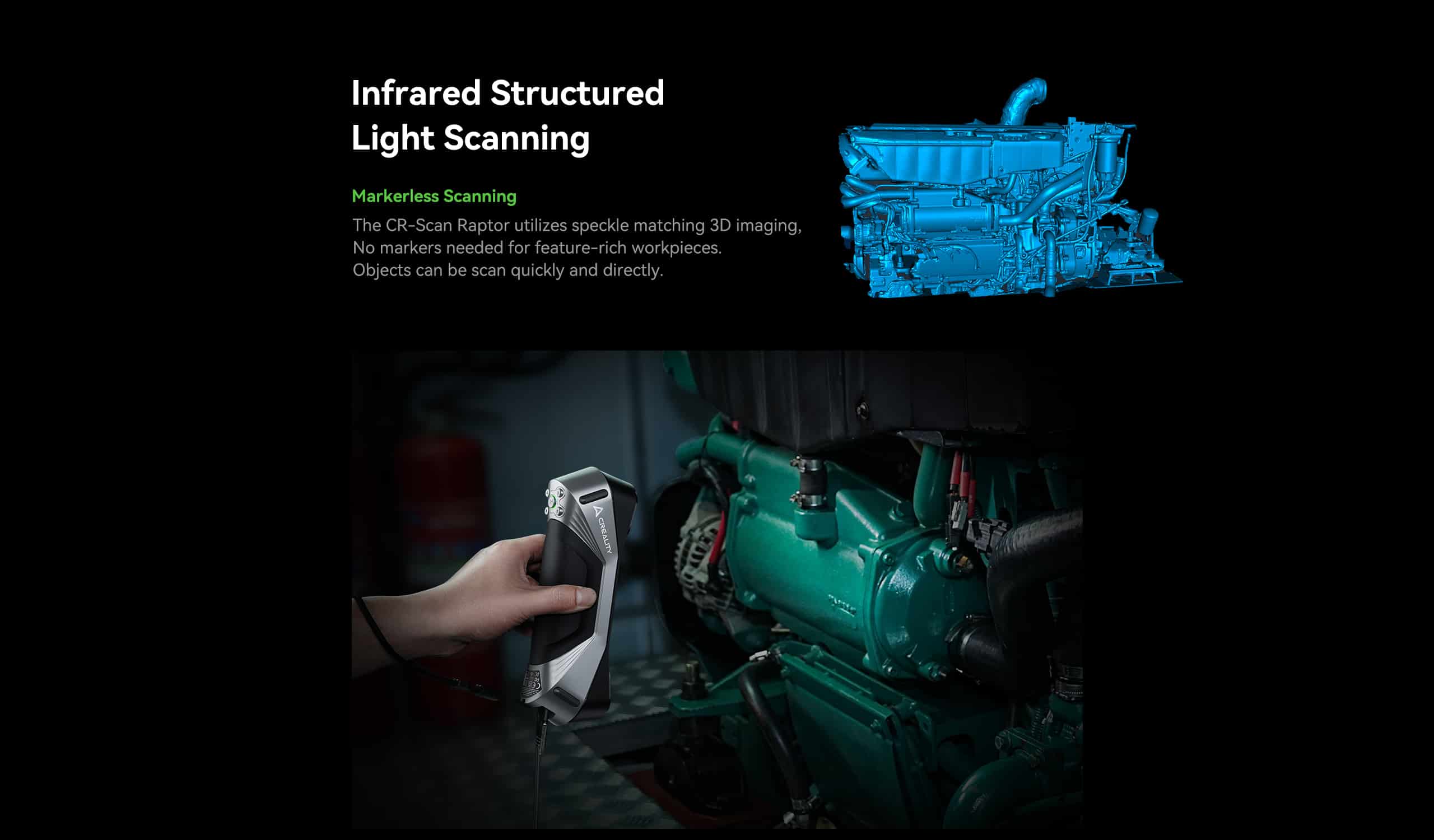 - Dualer Lichtquellenmodus: Raptor integriert zwei Sätze von Lichtquellen, blauer Laser und Infrarotlicht, die das Scannen von kleinen, mittleren und großen Objekten (5 mm bis 2.000 mm) abdecken und die Anforderungen verschiedener industrieller 3D-Scanszenarien erfüllen.