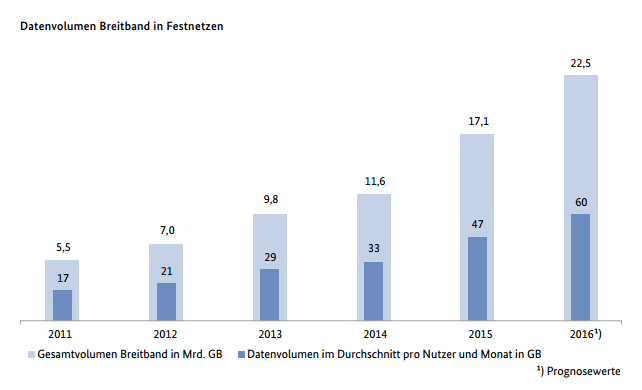 Eingangs bereits angedeutet, stieg das verbrauchte Datenvolumen in Deutschland weiter rasant an. Im Festnetz verbrauchten die Deutschen 22,5 Milliarden Gigabyte. Pro Nutzer werden somit durchschnittlich 60 Gigabyte im Monat verbraucht. Als Vergleich können beispielsweise die Daten aus dem Jahr 2013 herangezogen werden – hier lag der durchschnittliche monatliche Verbrauch pro Nutzer bei 30 Gigabyte. Das monatliche Datenvolumen pro Nutzer hat sich innerhalb eines Zeitraums von drei Jahren also verdoppelt.