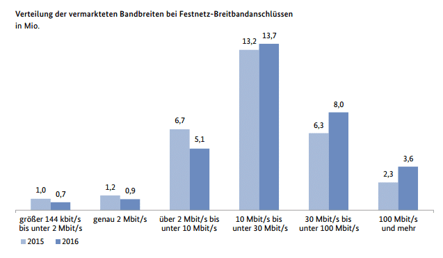 Zudem ist ein weiterer Anstieg der absoluten Zahl an Breitbandanschlüssen zu beobachten. Während im Jahr 2015 30,7 Millionen dieser Anschlüsse registriert waren, waren es 2016 bereits 32 Millionen. Dieser leichte Anstieg bestätigt die Entwicklungen der vorhergehenden Jahre. BWA, Festverbindungen, FTTB/FTTH, HFC und Satellit konnten indes stärker zulegen als klassische DSL-Verbindungen. Insgesamt existieren mit 8 Millionen dieser „anderen“ Anschlüsse jedoch weit weniger als DSL-Anschlüsse in Deutschland existieren – 24 Millionen.