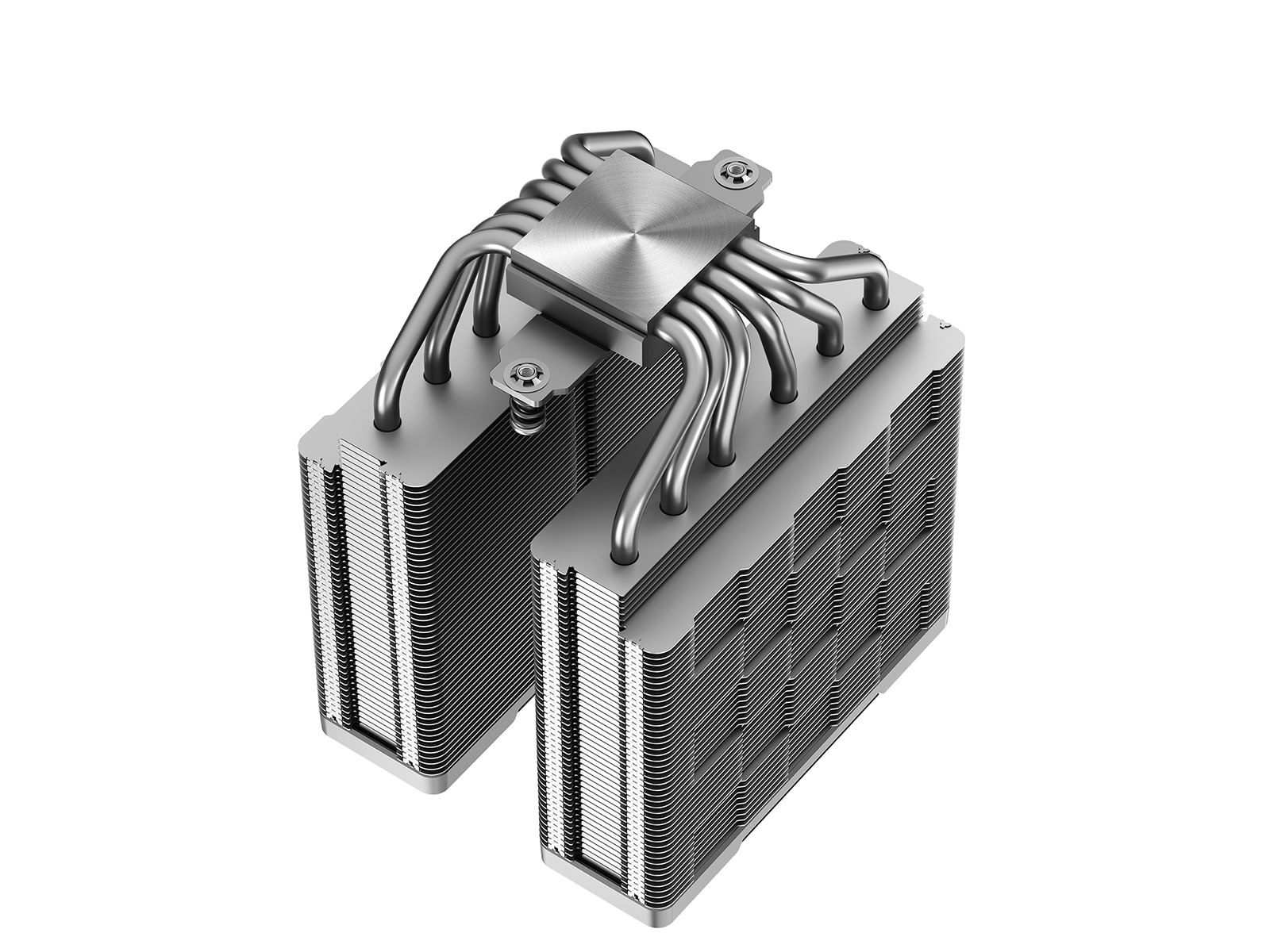 Der Deepcool AK620 kommt bei Abmessungen von 127 × 110 × 157 Millimetern für den reinen Kühlkörper und 129 × 138 × 160 Millimetern mit Lüftern sowie Abdeckungen auf ein Nettogewicht von 1.456 Gramm. Sechs vernickelte Kupfer-Heatpipes mit 6 Millimetern Durchmesser führen von der konvexen Bodenplatte weg.