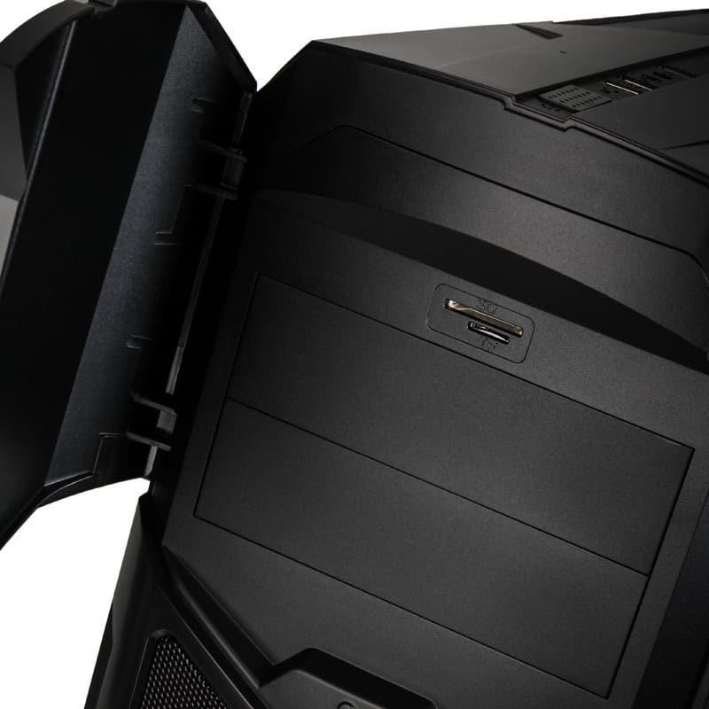 Der Kolink Vault bietet mit drei vorinstallierten Lüftern einen guten Airflow und für das „Gaming-Ambiente“ werden die 120-mm-Fans mit roten LEDs beleuchtet. Wer auf ein optisches Laufwerk nicht verzichten möchte, kann über die 5,25-Zoll-Frontblende einen Blu-Ray-Player oder DVD-Brenner nachrüsten. Das Innere des Towers ist für das Mikro-ATX-Mainboard vielleicht etwas überdimensioniert, aber so können die Kabel sauber verlegt werden, damit der Blick durch das Seitenfenster umso beeindruckender wirkt.