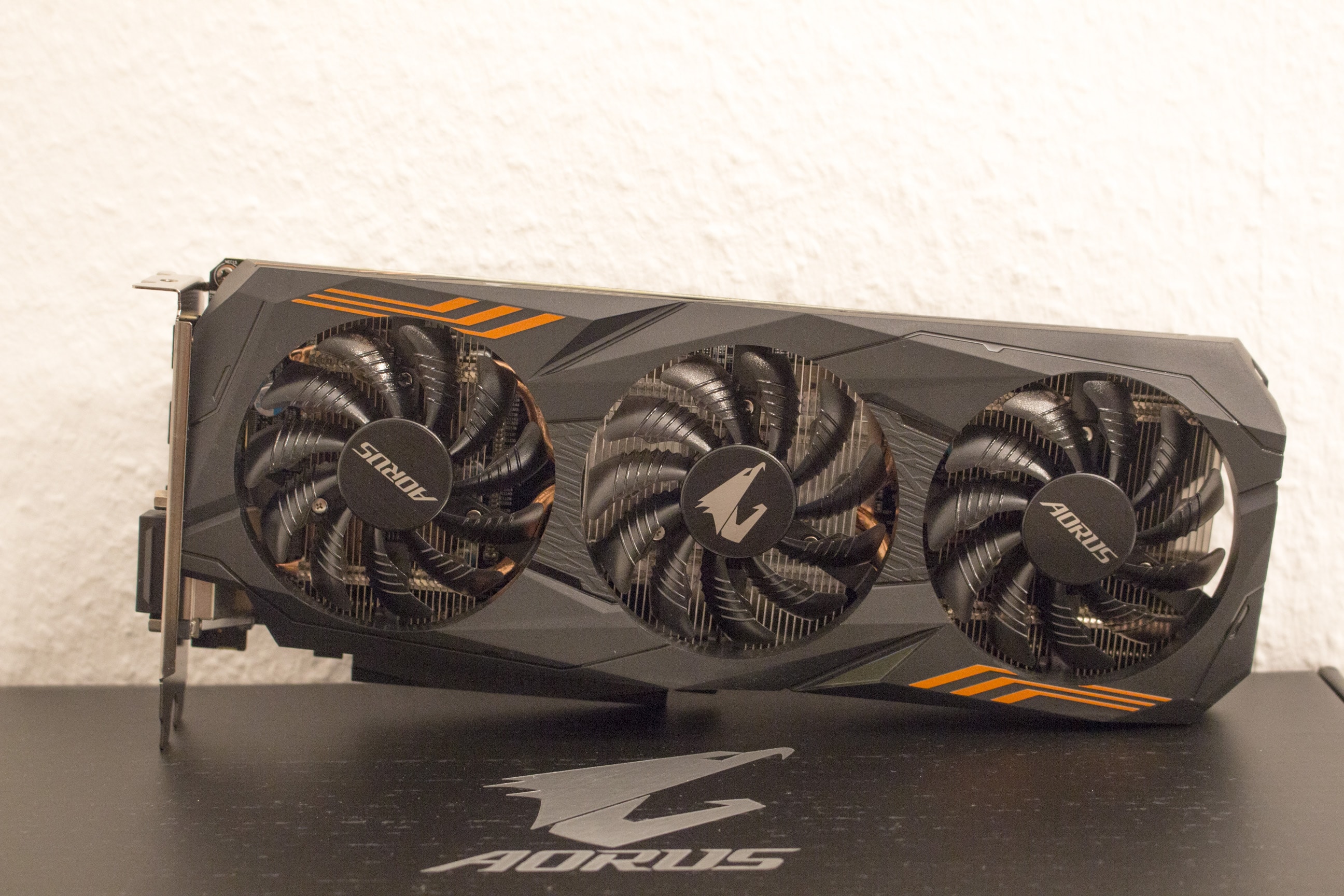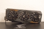 Beide Blöcke besitzen Aufbauten mit einer durch Lamellen vergrößerten Oberfläche, welche die im Betrieb entstehende Hitze abgeben. Im Fall der GeForce GTX 1060 Aorus 6G verwirbeln gleich drei große Lüfter die Luft und kühlen damit die Grafikkarte. Sollte die Karte nicht unter Last arbeiten, drehen diese Lüfter zudem langsamer oder gar nicht, wodurch die Grafikkarte zum Beispiel beim Gucken von Youtube-Videos oder Netflix nicht zu hören ist.